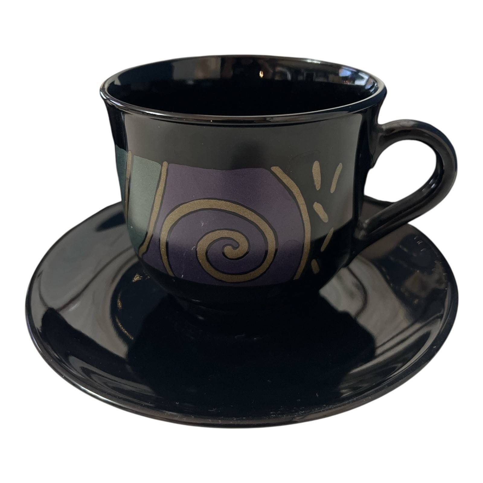Set of four vintage ARC France black glass cups with matching saucers. Each cup features a bold swirl motif in purple, teal, and gold against a glossy black finish. Made in France, this espresso or demitasse set reflects the modern decorative style popular in the 1990s. A striking addition to any table setting or glassware collection.