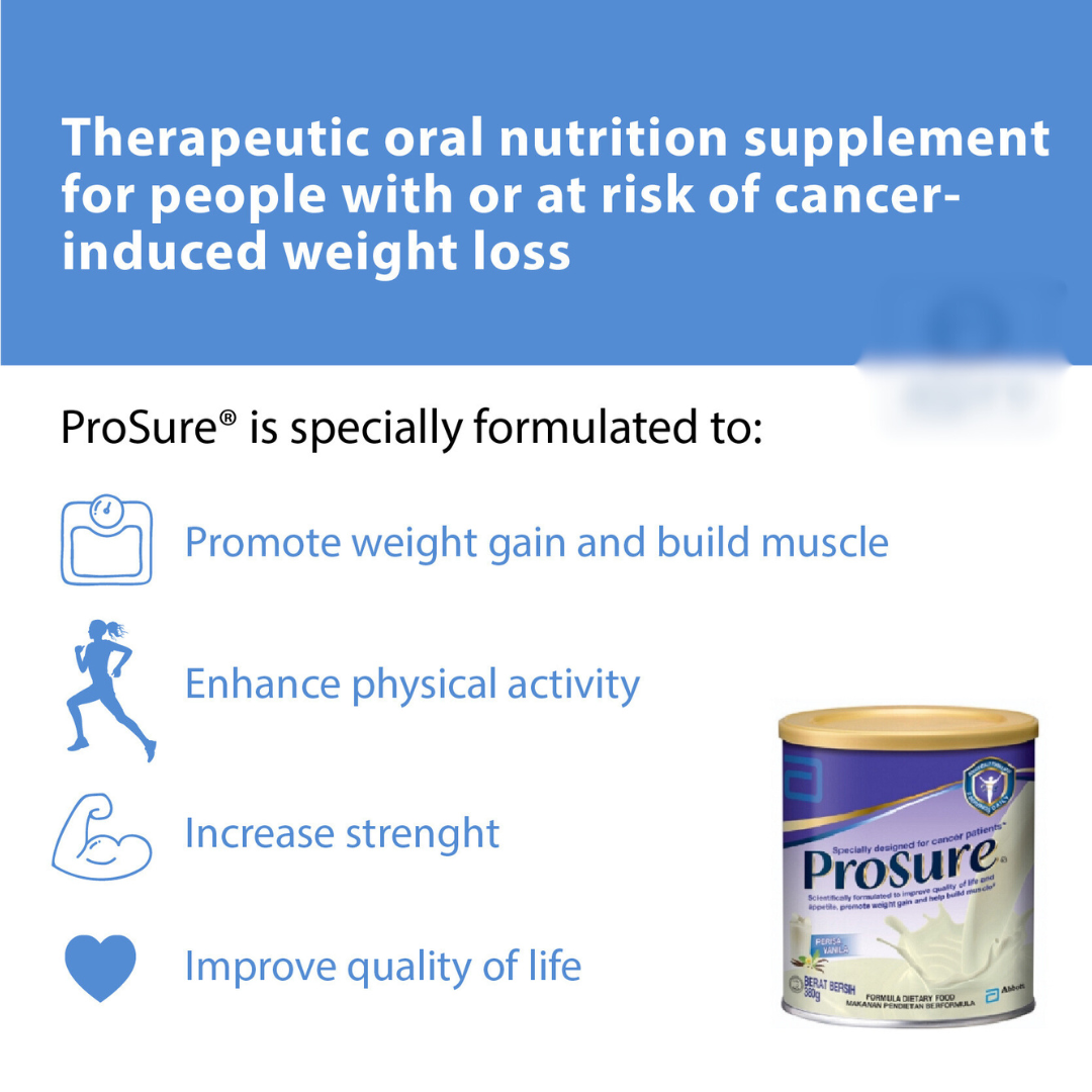 Prosure is scientifically designed to help you gain weight and increase energy while on chemotherapies. It is an energy-dense, high-protein formula enriched with EPA, designed to help normalize metabolism and build lean body mass (LBM) in people experiencing cancer-induced weight loss.