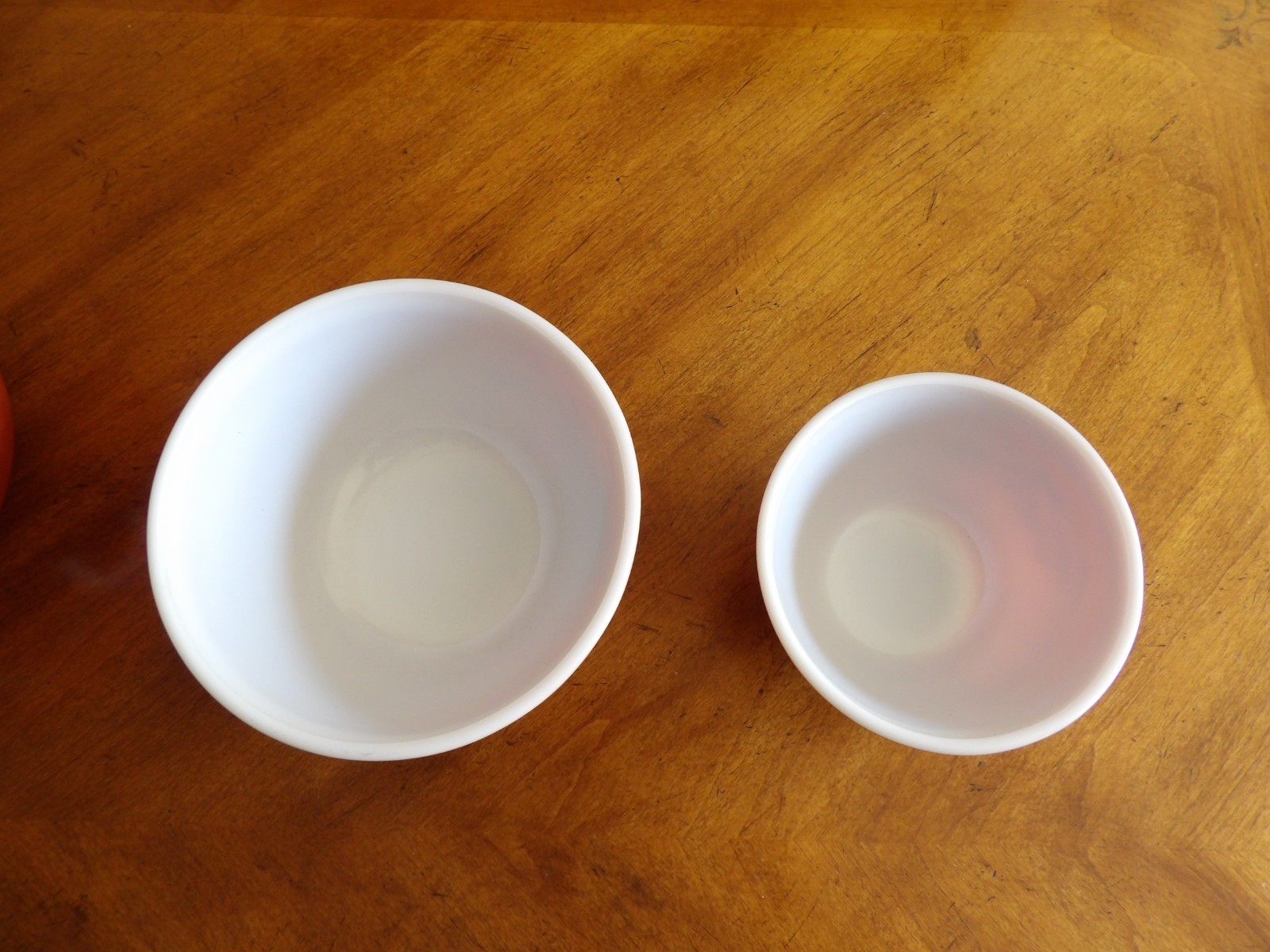 Bowl 403 has a paint chip. 404 has a brown stain / discoloration on the inside.