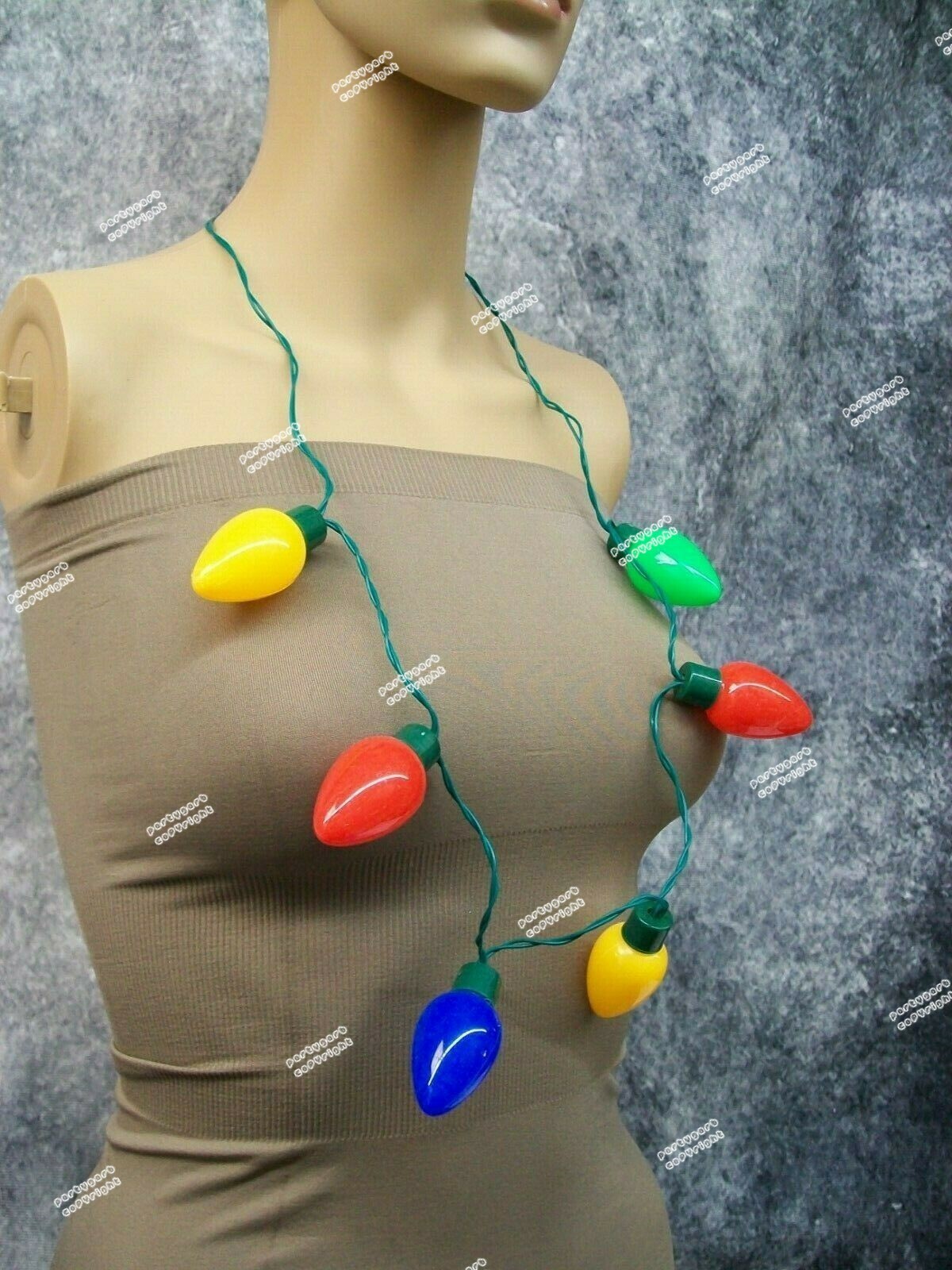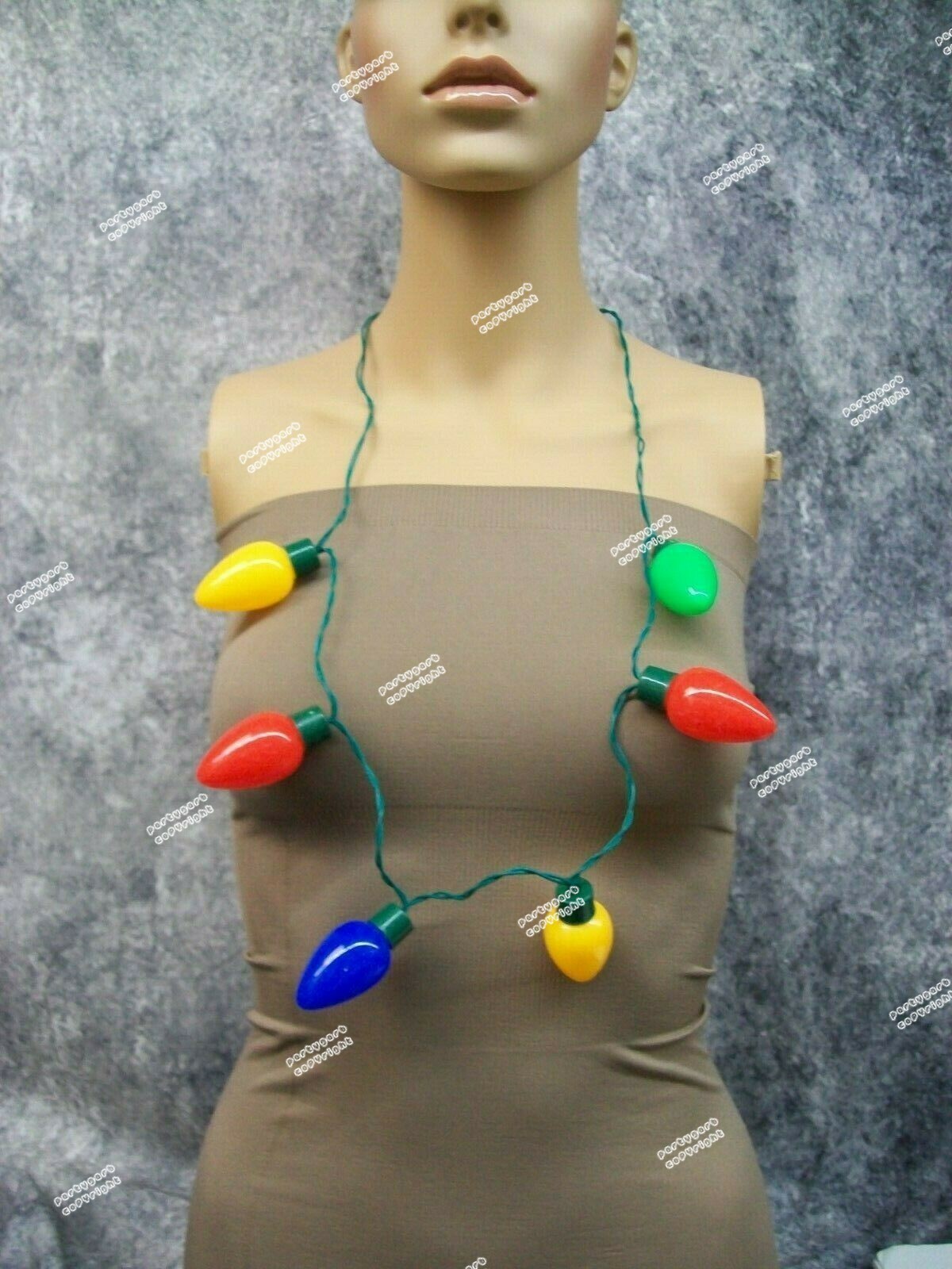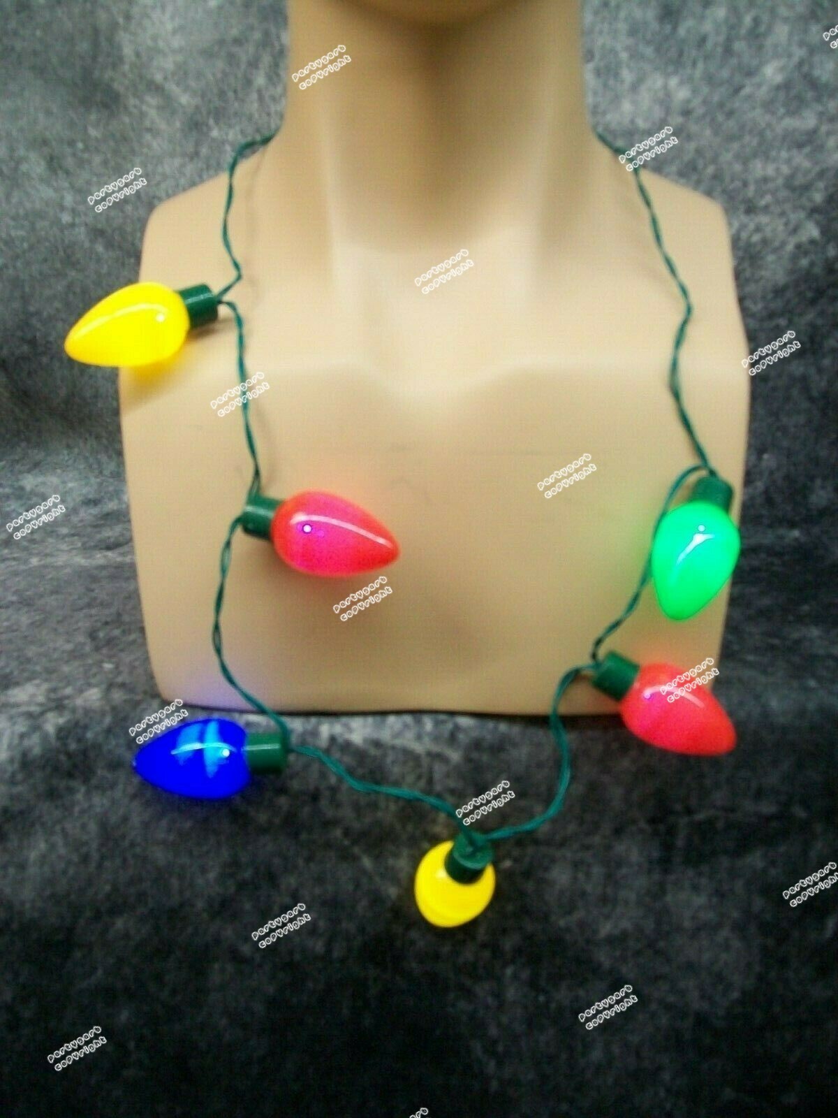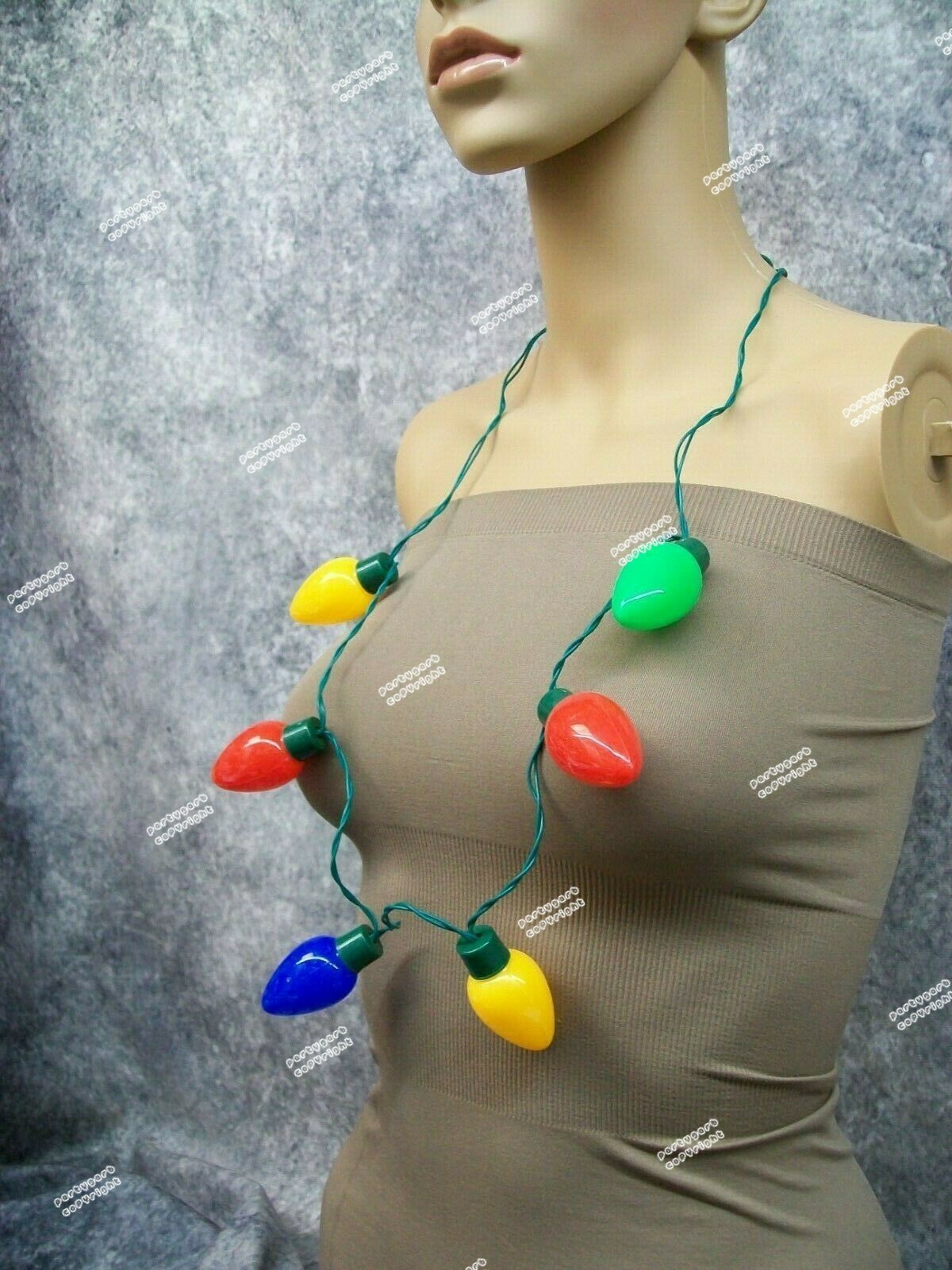 Light Up Plastic Christmas Bulb Necklace. Necklace has 6 plastic bulbs on a green wire. Bulbs are alternating Primary colors. Red, Green, Blue, and Yellow. Color variety may vary per necklace. On / Off Button on the green plastic capsule. Press button to activate and change settings.