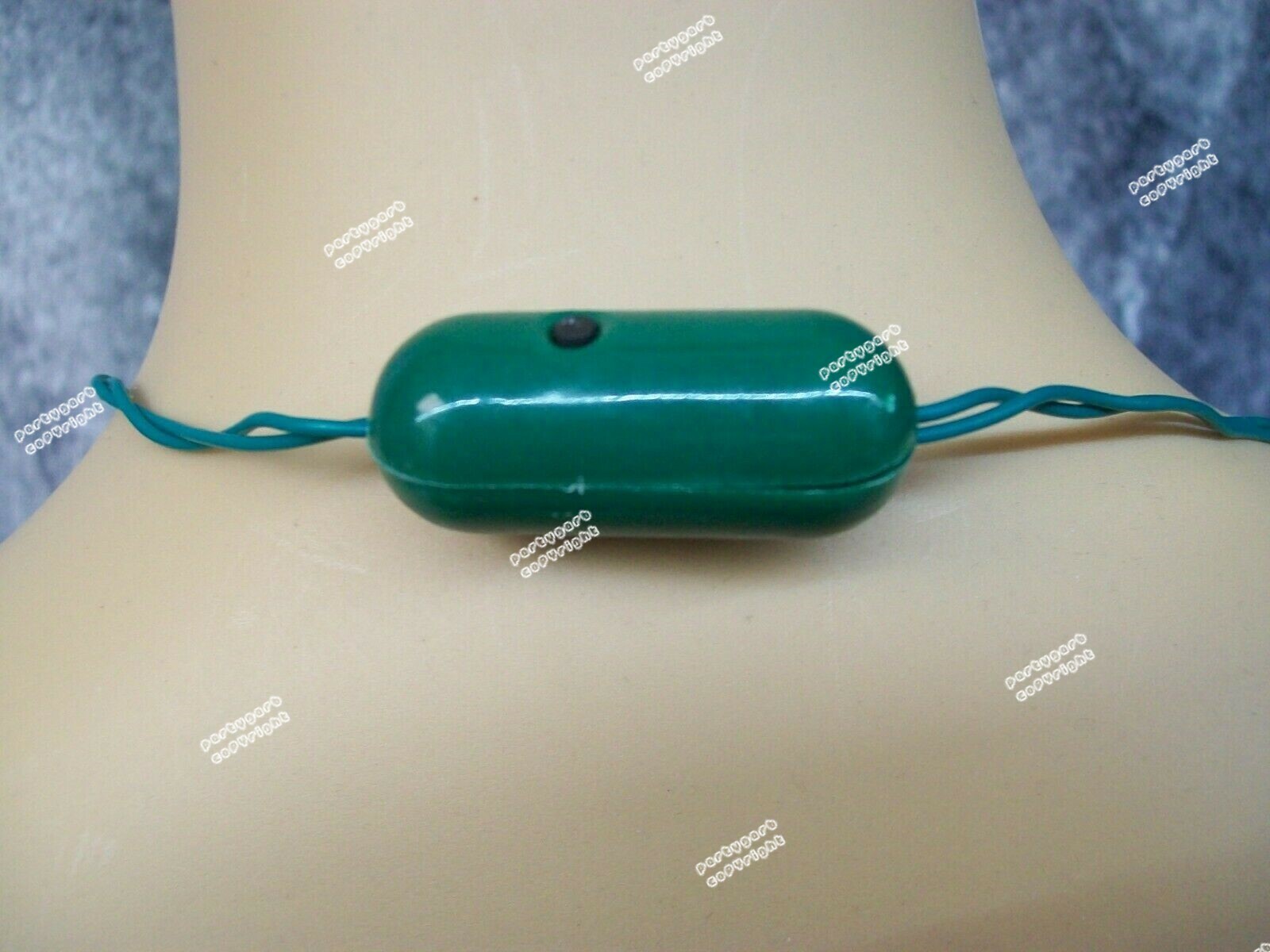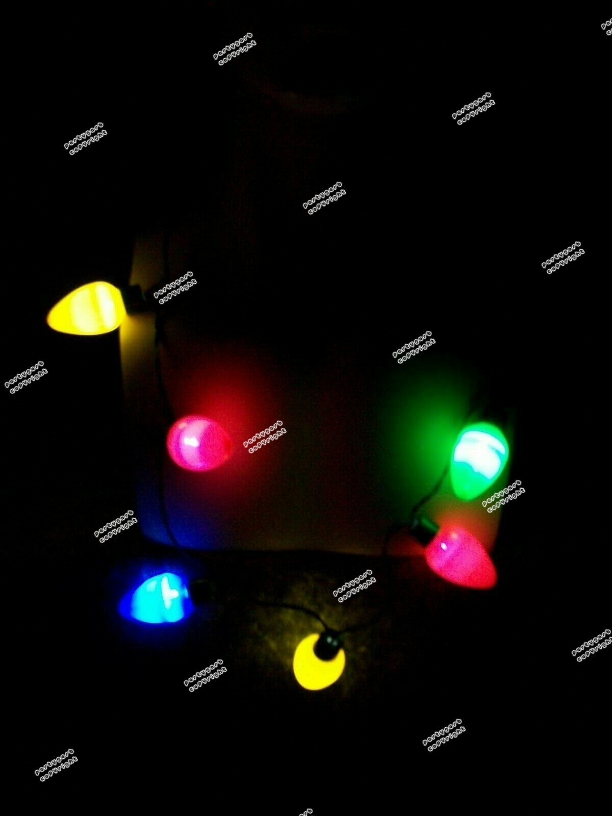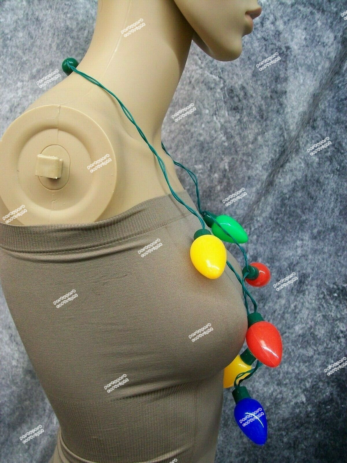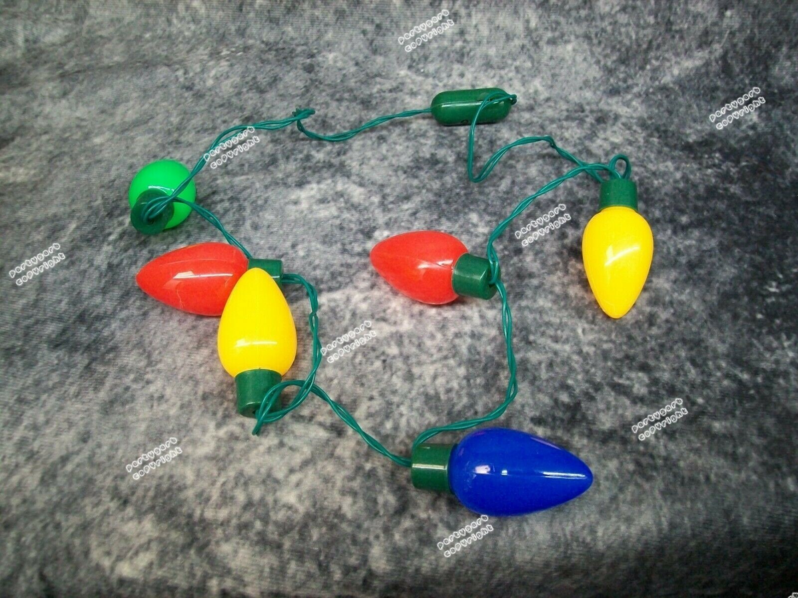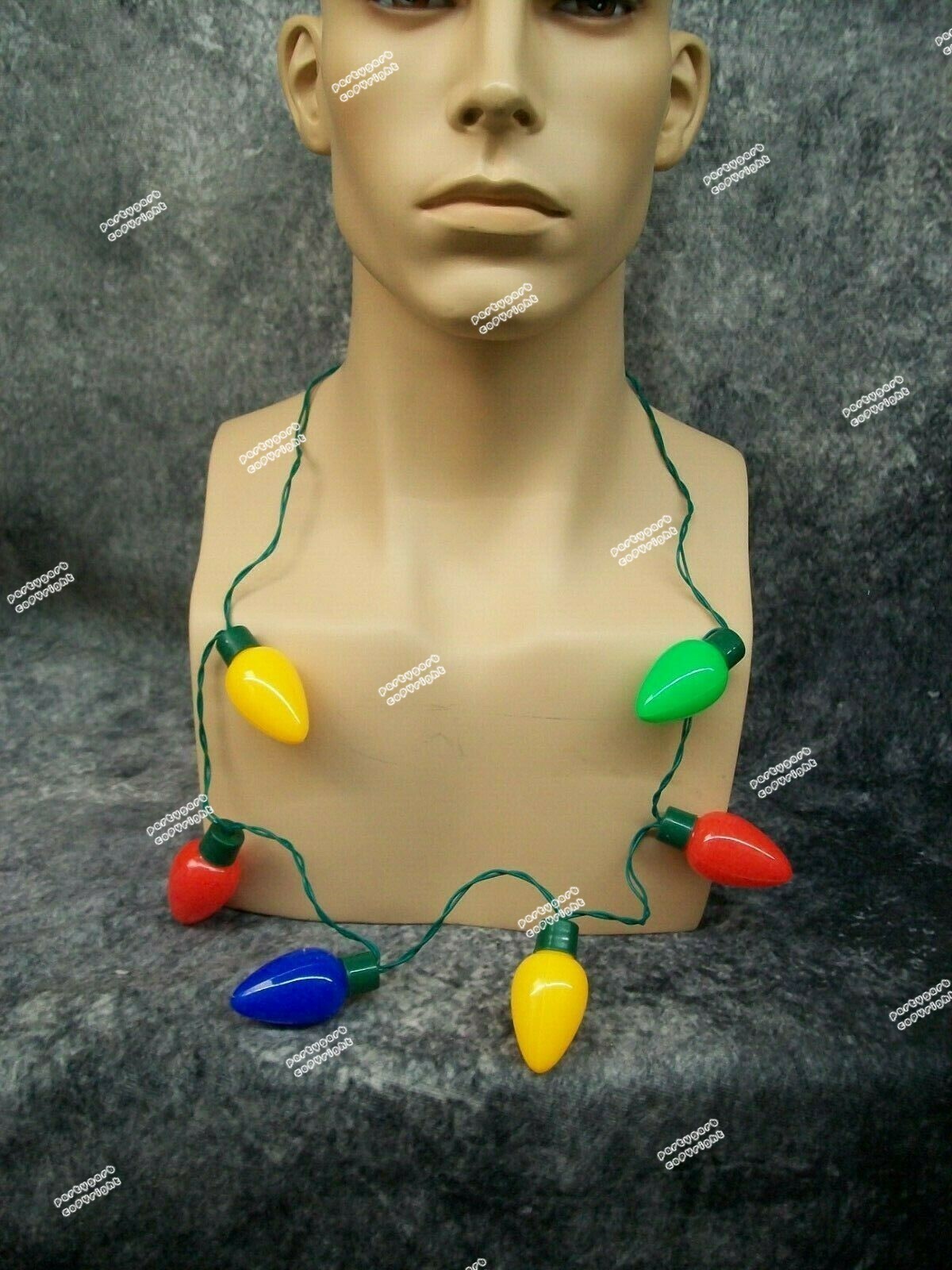 Light Up Plastic Christmas Bulb Necklace. Necklace has 6 plastic bulbs on a green wire. Bulbs are alternating Primary colors. Red, Green, Blue, and Yellow. Color variety may vary per necklace. On / Off Button on the green plastic capsule. Press button to activate and change settings.