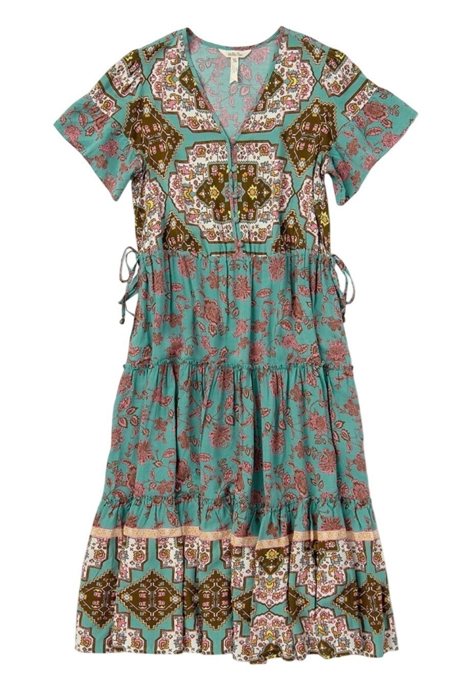 The Matilda Jane Boho Floral Dress features a vibrant pattern and a comfortable fit. It includes short sleeves and tie details on either side, perfect for a casual day out or a relaxed gathering. Its lightweight fabric offers comfort and style.