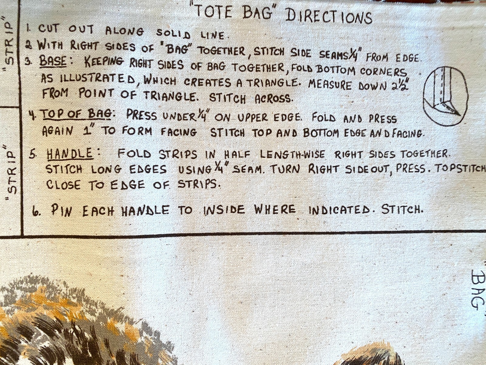 The finished bag should be app. 17" square, instructions printed right on material.