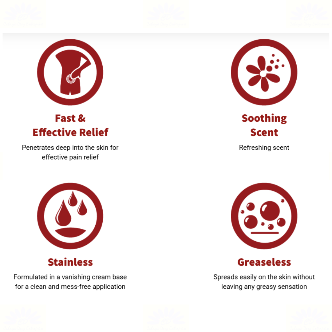Fornisce sollievo rilassante per dolori e dolori dovuti a: sovraeserzione, maltrattamenti, rigidita, dolori articolari, artrite, distorsioni.