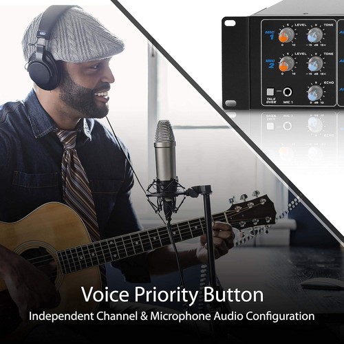 * Voice priority button: The home amplifier with Bluetooth sound mixer device features mic talk-over function where the background music is minimized by pushing the button when the signal is inputted to Mic1. Used in paging, voiceover and announcements