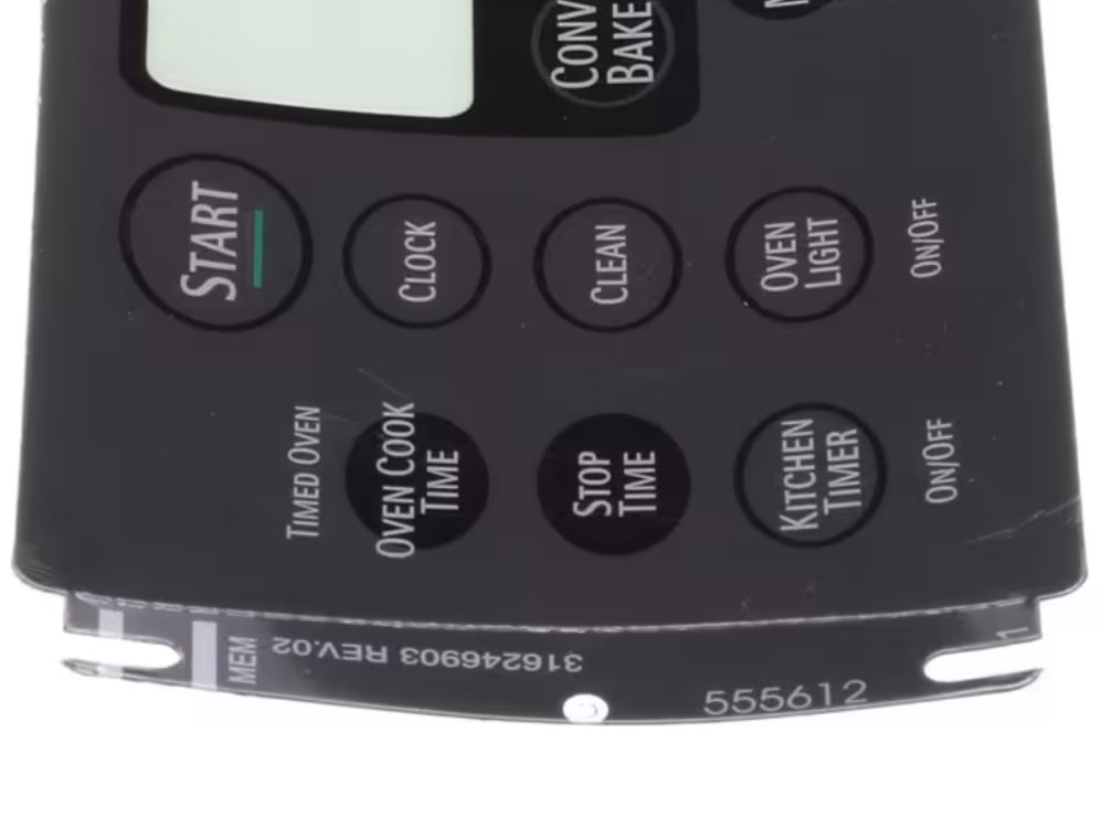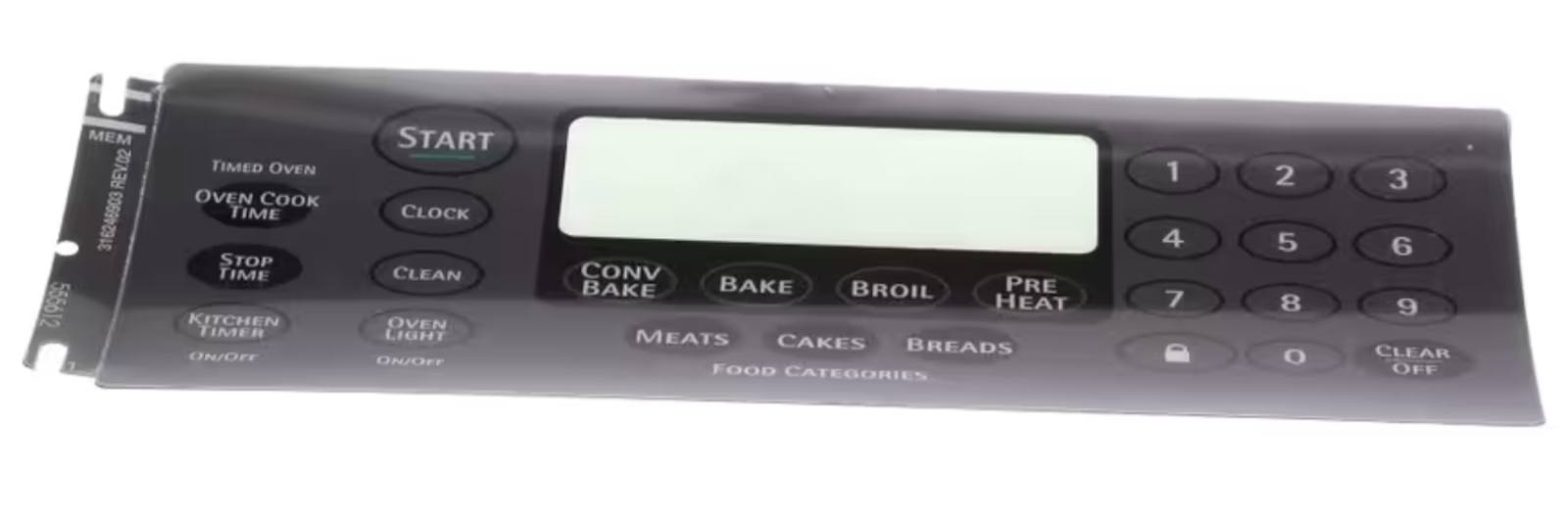 The Frigidaire 555612, 316246903 Overlay, Clock (Graphite Gray) is a genuine OEM replacement part for ranges. This overlay fits over the electronic clock/timer control, providing clear labeling for oven functions and settings while giving your appliance a clean, factory-original appearance. If your existing overlay is worn, peeling, or faded, replacing it restores both usability and style.