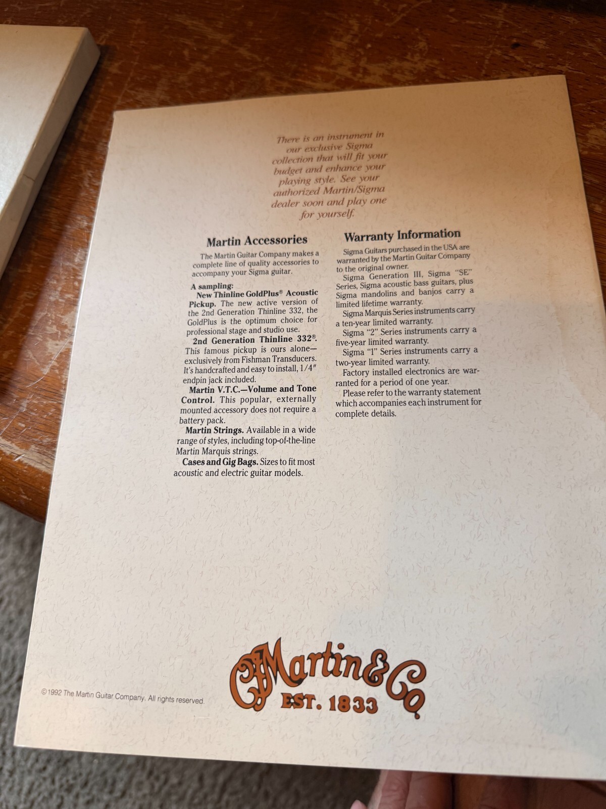 Vintage 1992 Martin Sigma Guitar Dealer Sales Brochure