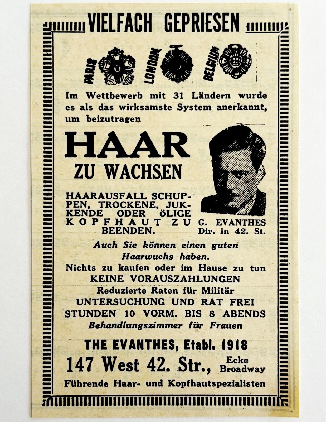 1945 WW2 German-USA Advertisement Evanthes Hair Treatment Clinic NYC C94C