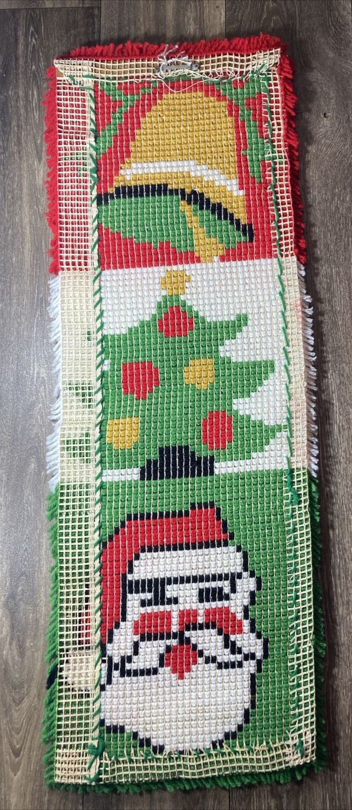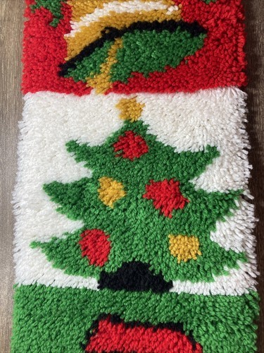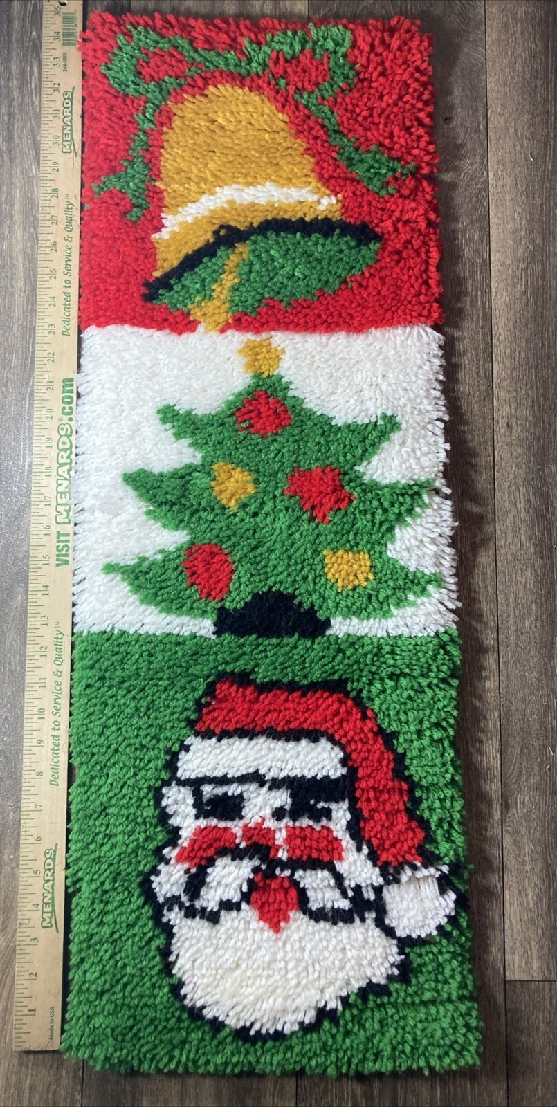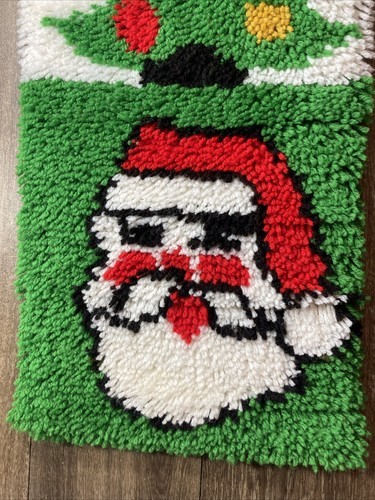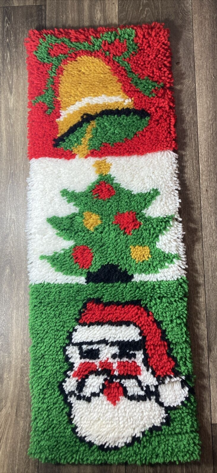 Get into the Christmas spirit with this charming completed latch hook rug wall hanging. Featuring a delightful scene with Santa, bells, and a tree, this holiday collectible is perfect for any Christmas enthusiast. The rug is expertly crafted and ready to be displayed in your home or office. Ideal for collectors, this item is a must-have for anyone who loves to decorate for the holidays.
