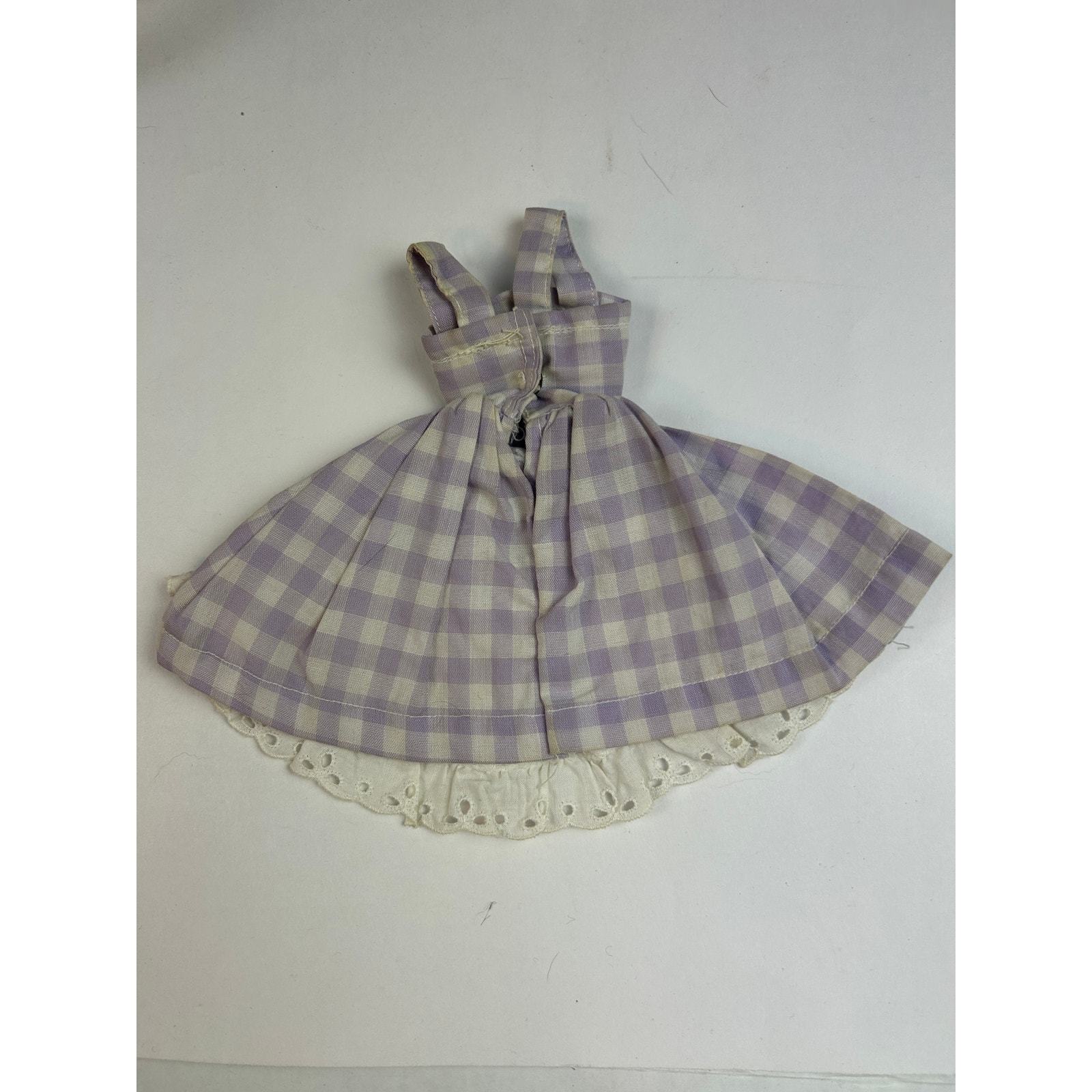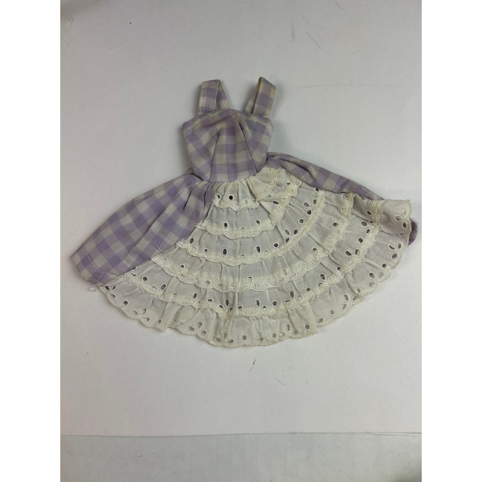 Sweet 1960s Barbie-size clone sundress in lavender/cream gingham with cascading white eyelet ruffle tiers. Strappy bodice, full skirt, and a metal snap back?clean and display-ready with typical light play wear.