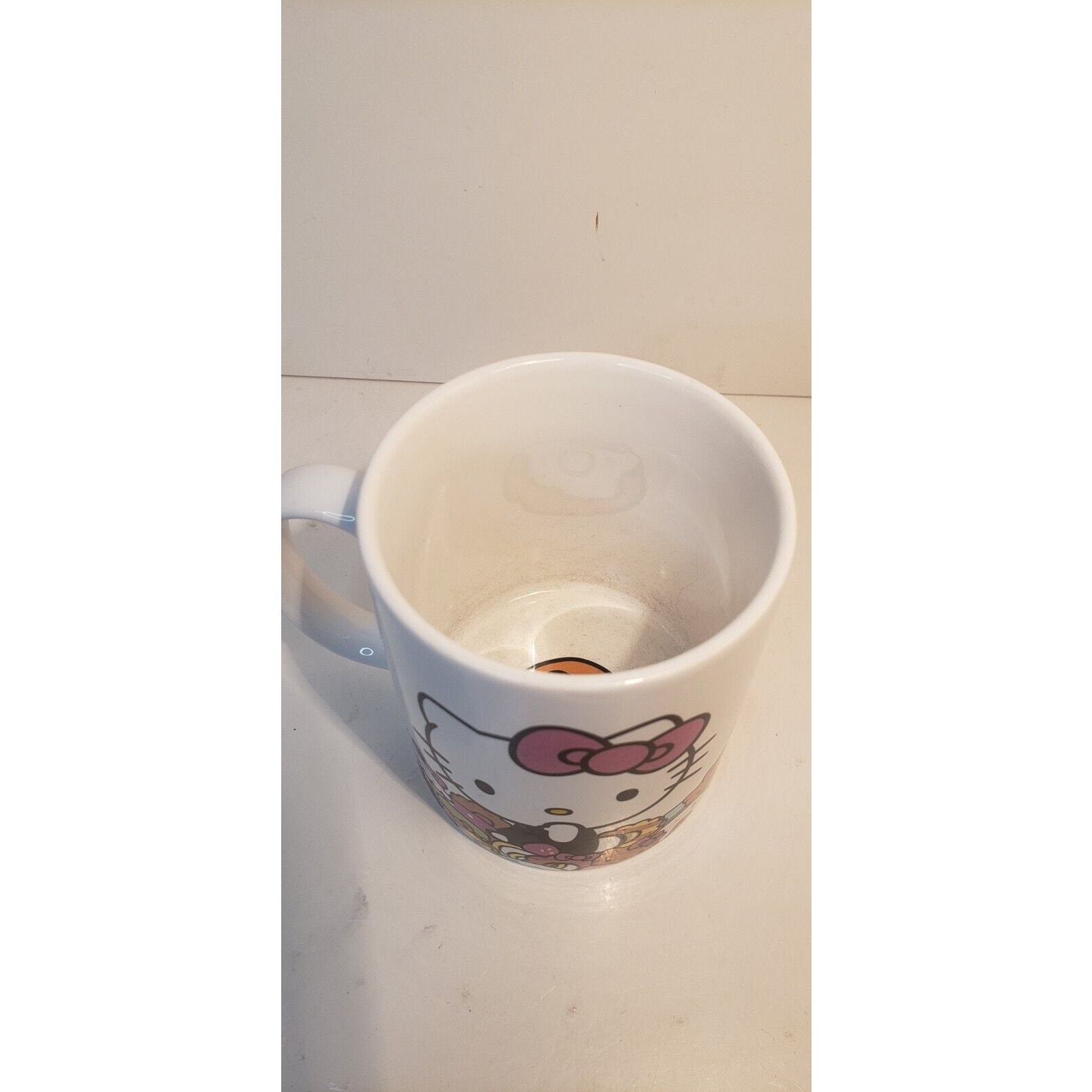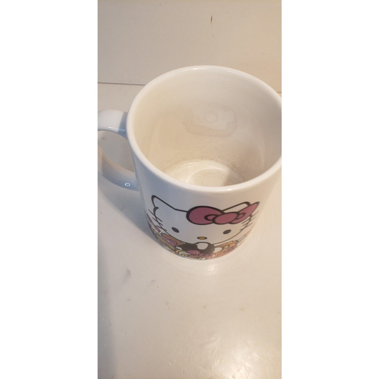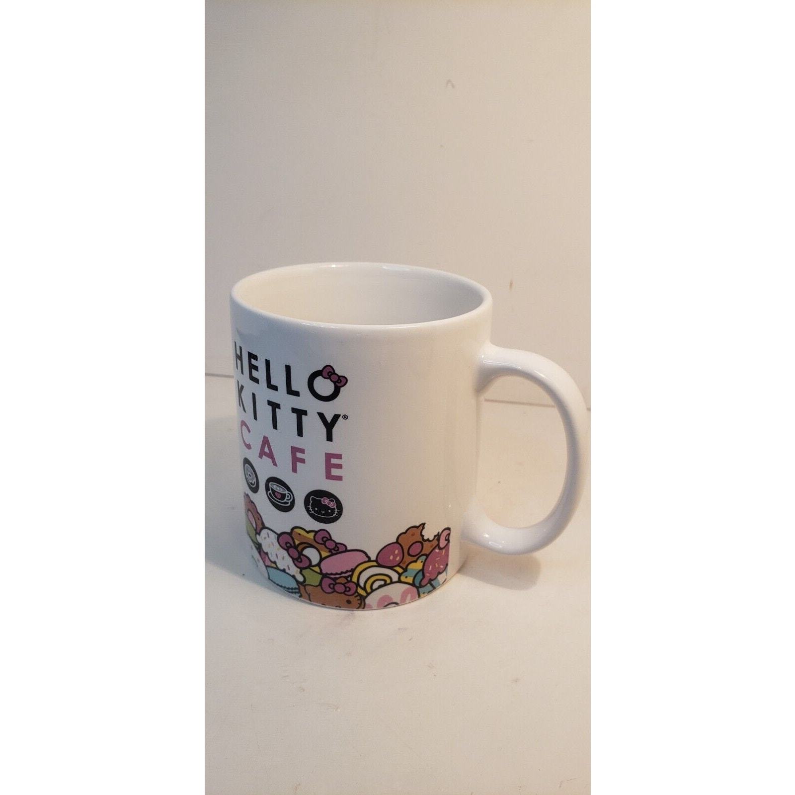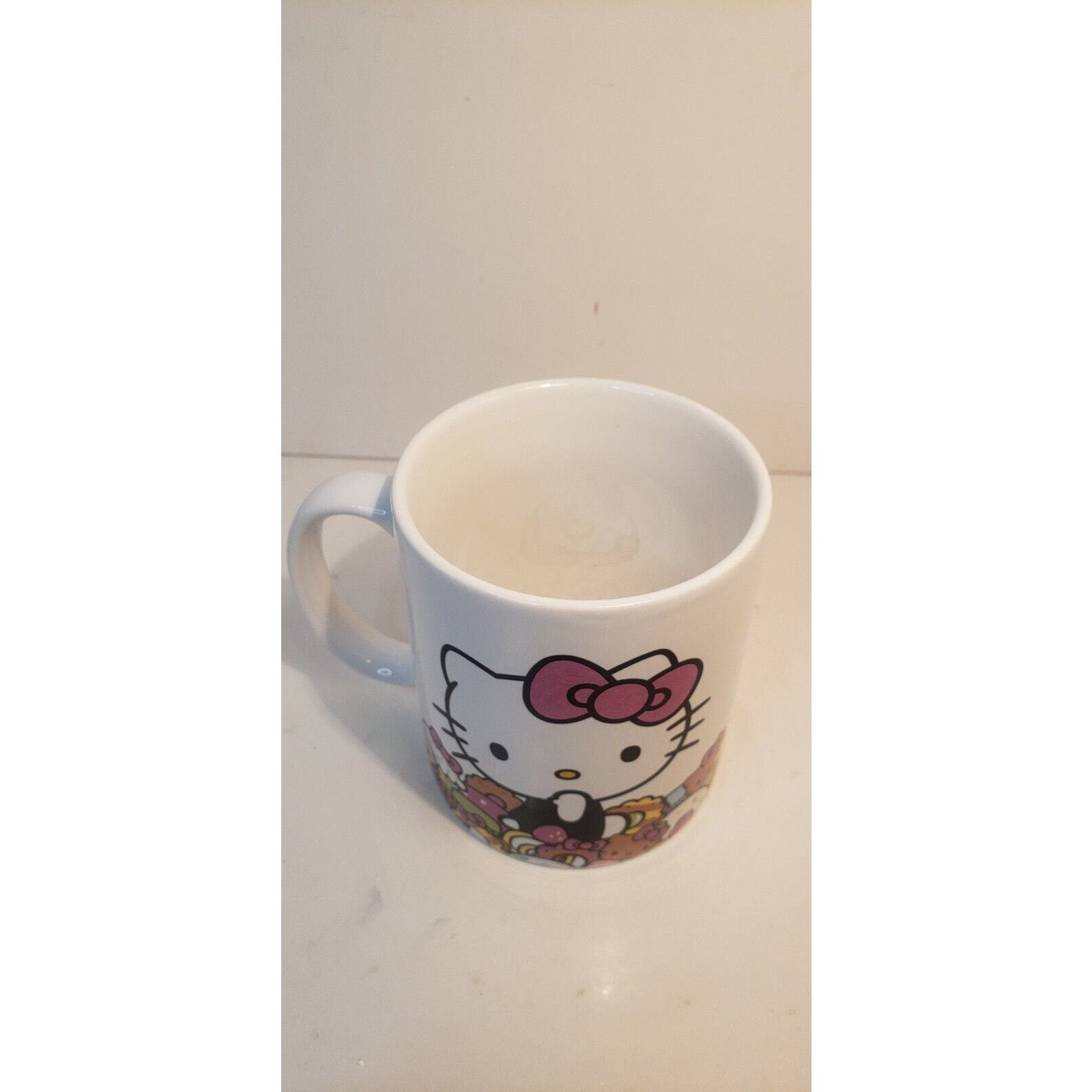 The product is a Hello Kitty Cafe Sanrio 2015 Ceramic Coffee Cup, featuring the character Hello Kitty surrounded by donuts and other sweets. There is also a donut inside the bottom of the mug. This exclusive collector's item has a height of 3 3/4 inches and a width of 3 inches, making it a unique addition to any Hello Kitty or animation merchandise collection. Manufactured in China as part of the Hello Kitty franchise, this mug is perfect for fans of the lovable Kitty character looking to enjoy their favorite hot beverages in style. *Bottom of mug has some discoloration on both side of mug. Please see pictures for further information.