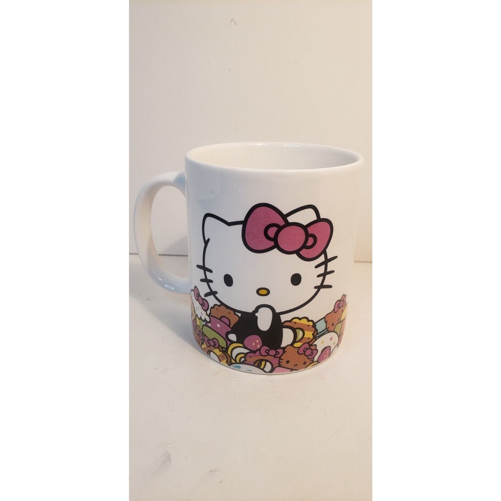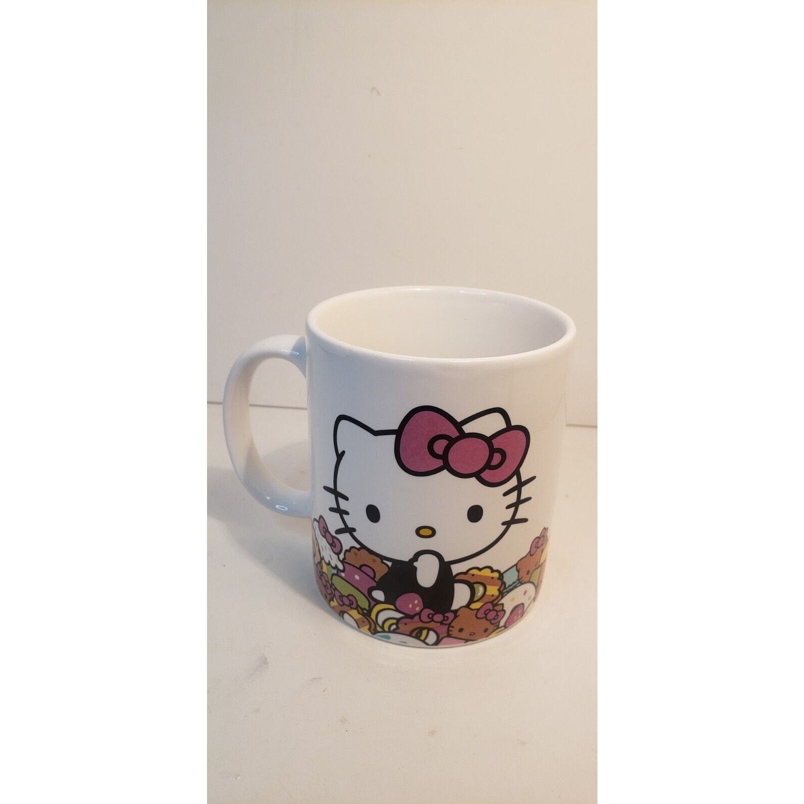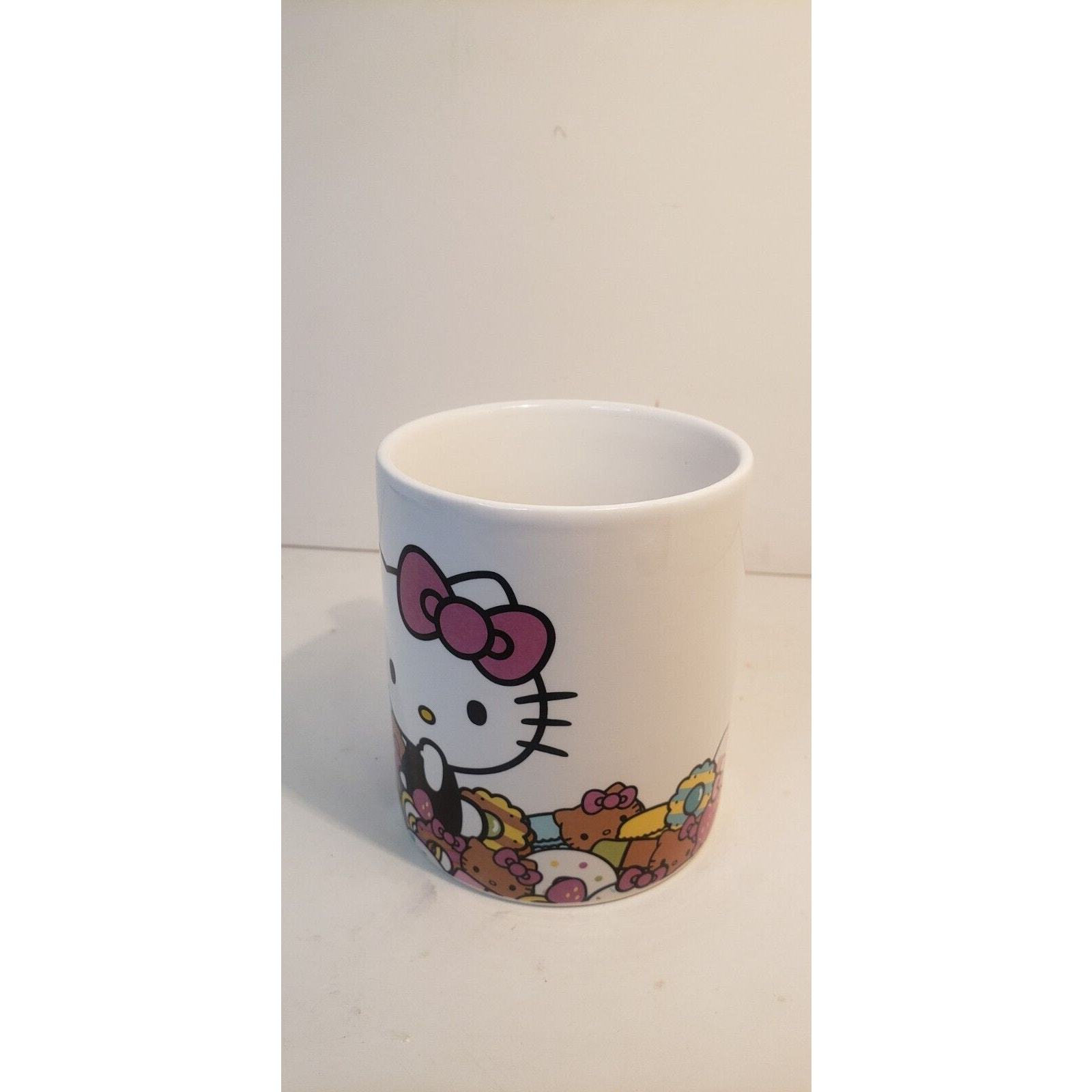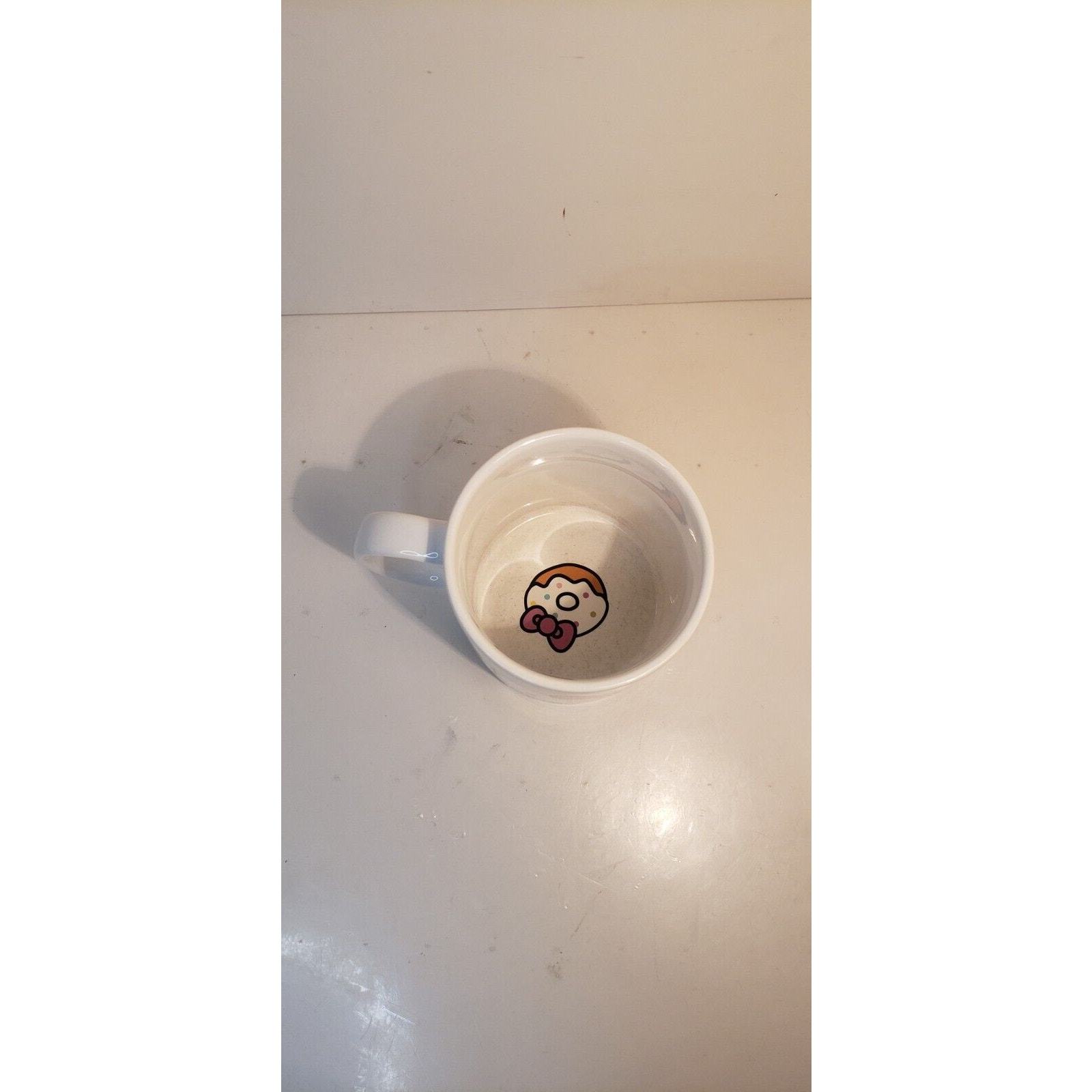 The product is a Hello Kitty Cafe Sanrio 2015 Ceramic Coffee Cup, featuring the character Hello Kitty surrounded by donuts and other sweets. There is also a donut inside the bottom of the mug. This exclusive collector's item has a height of 3 3/4 inches and a width of 3 inches, making it a unique addition to any Hello Kitty or animation merchandise collection. Manufactured in China as part of the Hello Kitty franchise, this mug is perfect for fans of the lovable Kitty character looking to enjoy their favorite hot beverages in style. *Bottom of mug has some discoloration on both side of mug. Please see pictures for further information.
