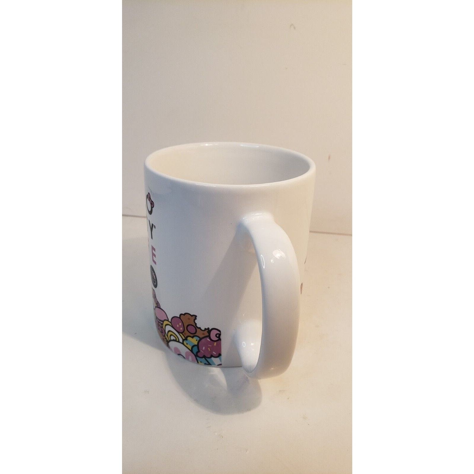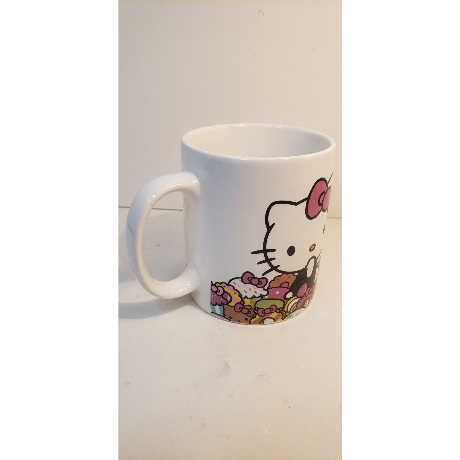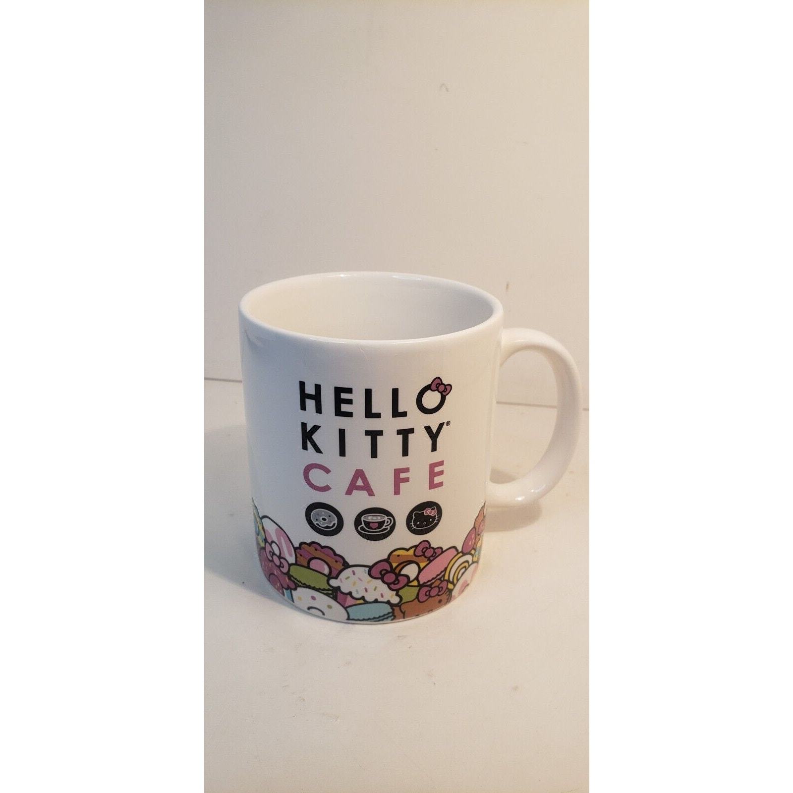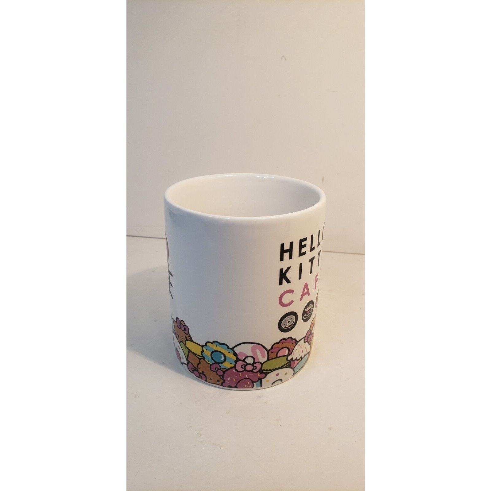 The product is a Hello Kitty Cafe Sanrio 2015 Ceramic Coffee Cup, featuring the character Hello Kitty surrounded by donuts and other sweets. There is also a donut inside the bottom of the mug. This exclusive collector's item has a height of 3 3/4 inches and a width of 3 inches, making it a unique addition to any Hello Kitty or animation merchandise collection. Manufactured in China as part of the Hello Kitty franchise, this mug is perfect for fans of the lovable Kitty character looking to enjoy their favorite hot beverages in style. *Bottom of mug has some discoloration on both side of mug. Please see pictures for further information.