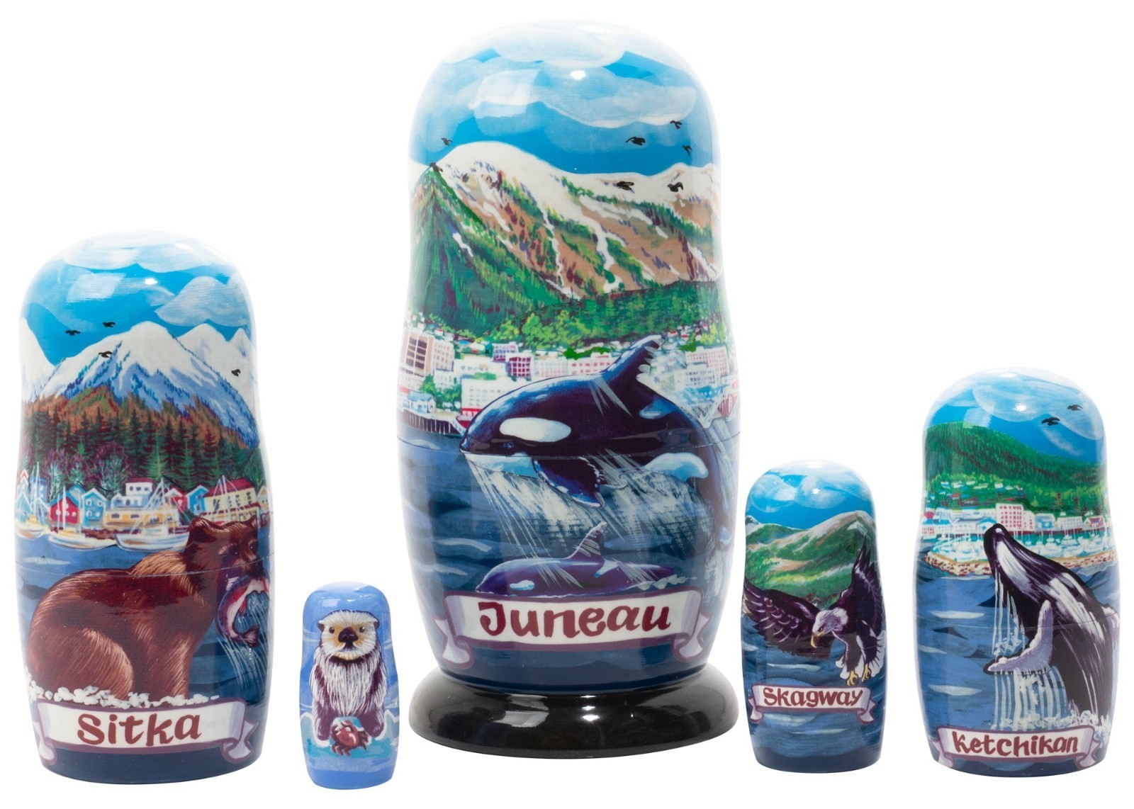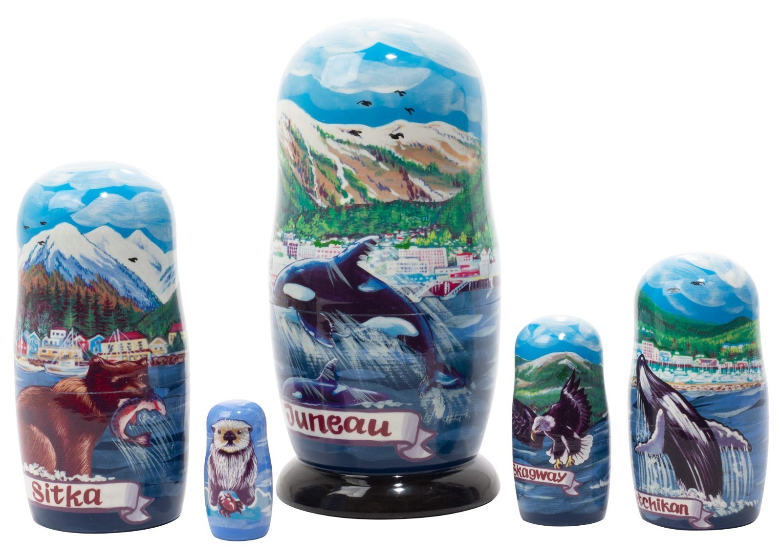 Handmade Alaskan Cruise Juneau Sitka Ketchikan Nesting Doll 5pc 6" 100% Wood