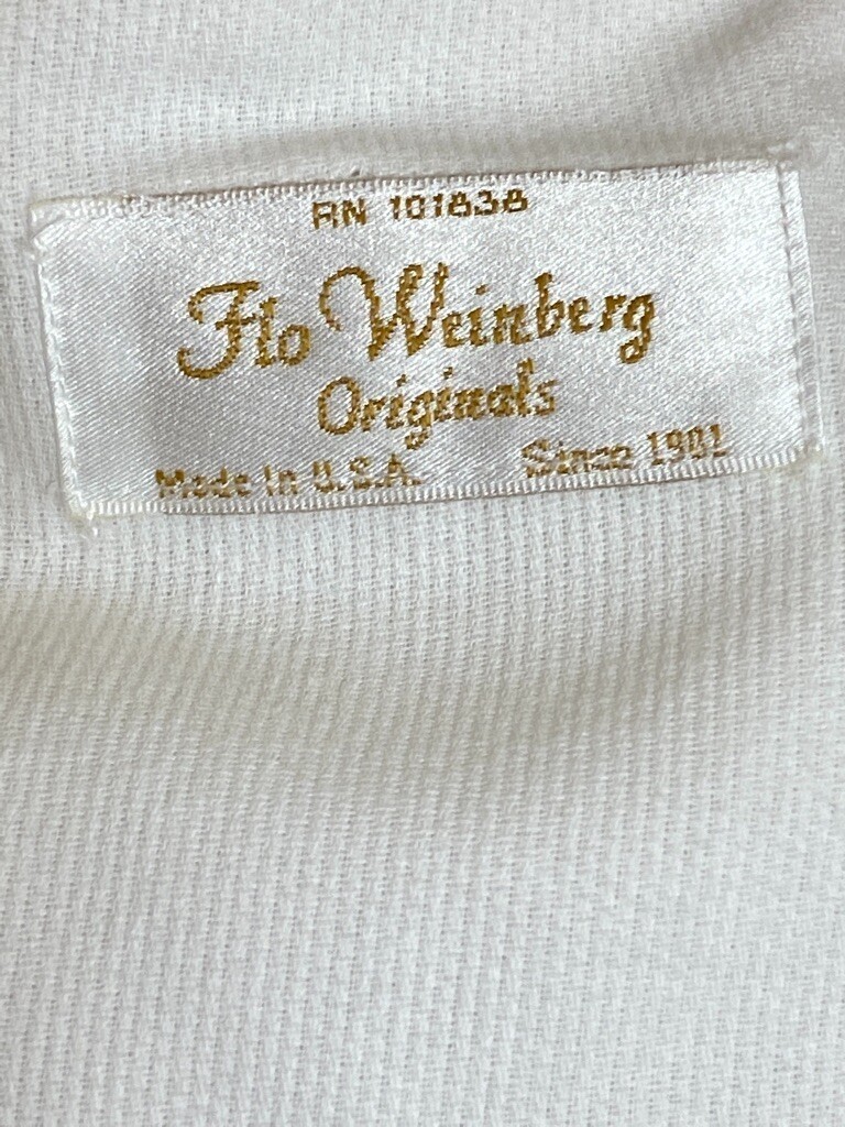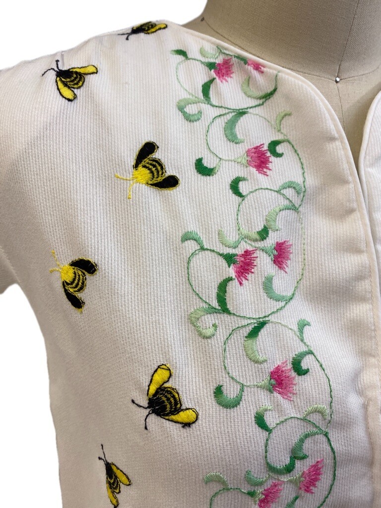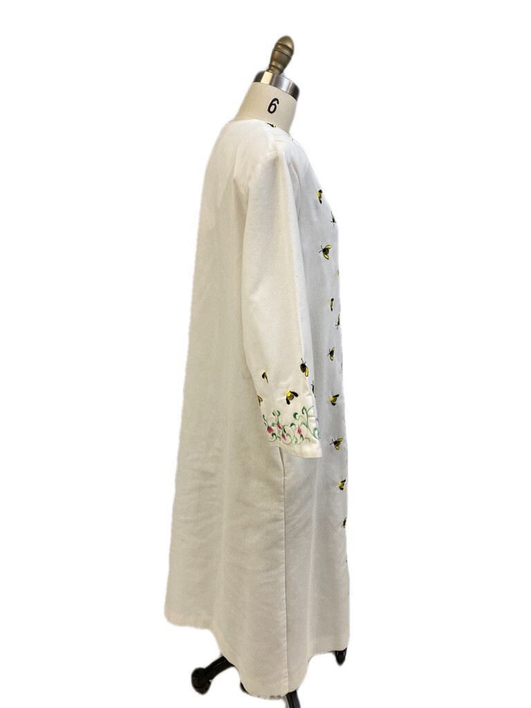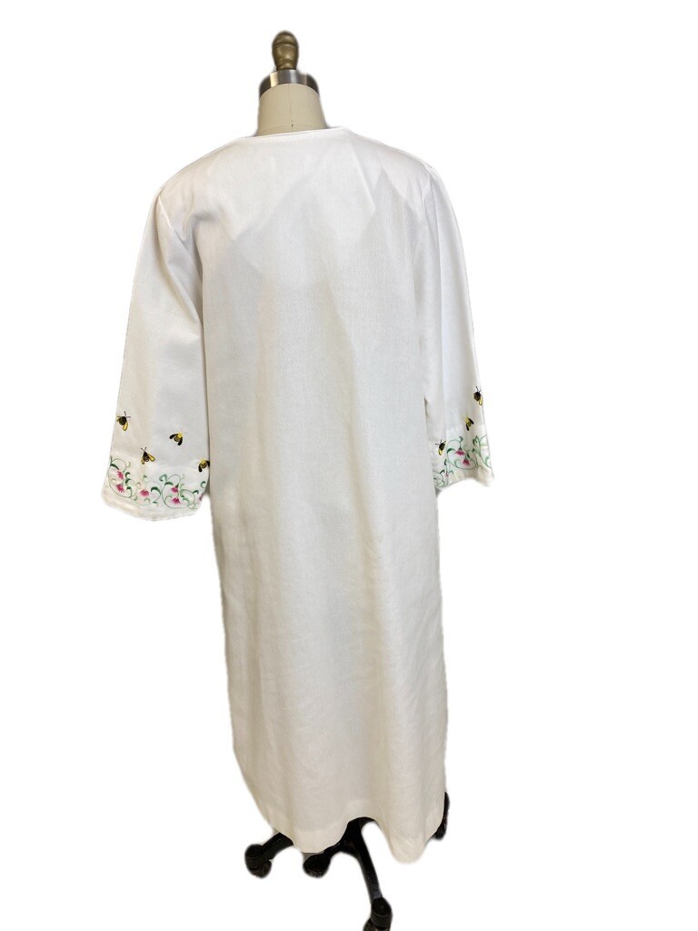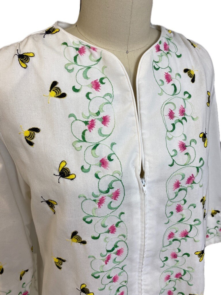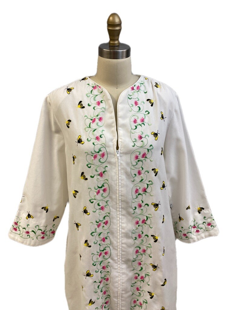 Cute Flo Weinberg vintage robe with popular " Bees" embroidered all over the front. Zip front with 2 side seam pockets. White Poly Cotton, has a sort of micro wale cord feel. A line shape with 3/4 sleeves also embroidered with bees. Can be worn as a dress, it is opaque.