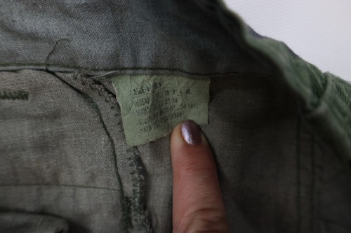 Blemishes front and back. Has fabric pulls, pilling and color fade. Discolored. Has a button fly. USA made. Inseam hemmed. Has missing stitching on the cuffs