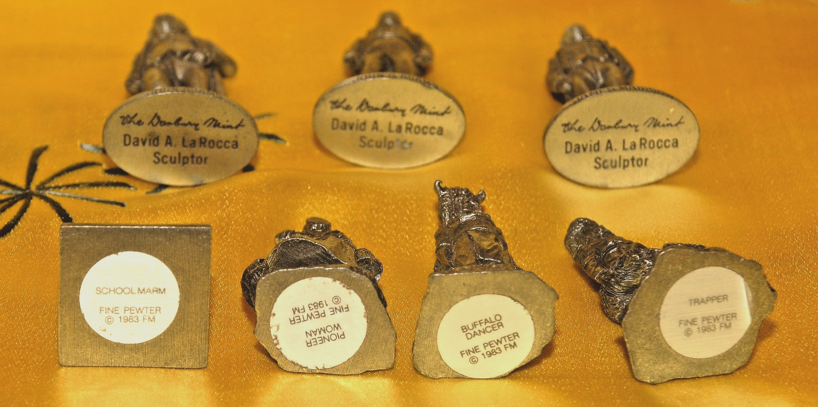THE REMAINING 4 ARE FROM A FRANKLIN MINT PEWTER SERIES FEATURING EARLY WESTERN PEOPLE, 1) "TRAPPER," 2) SCHOOL MARM, 3) PIONEER WOMAN 4) NATIVE AMERICAN BUFFALO DANCER.