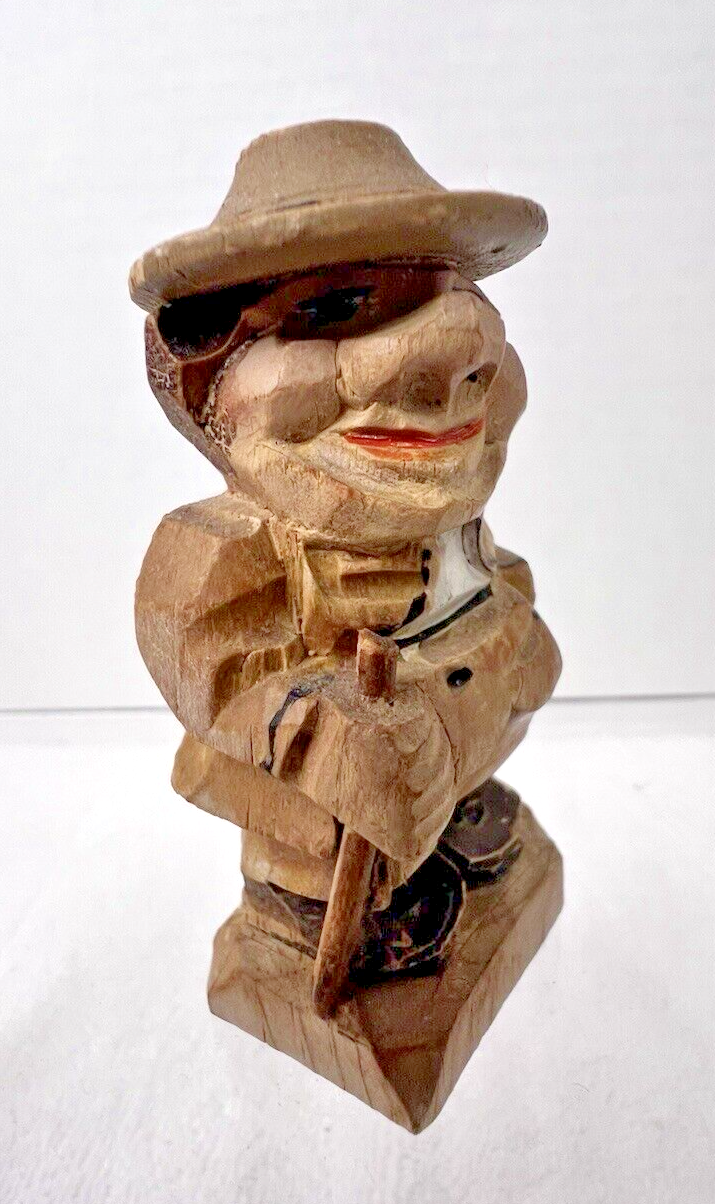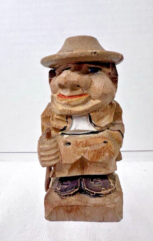 Folk Art Hand Carved Man with Hat and Walking Stick 2 1/2" tall Rather Large Nose