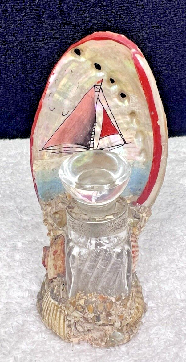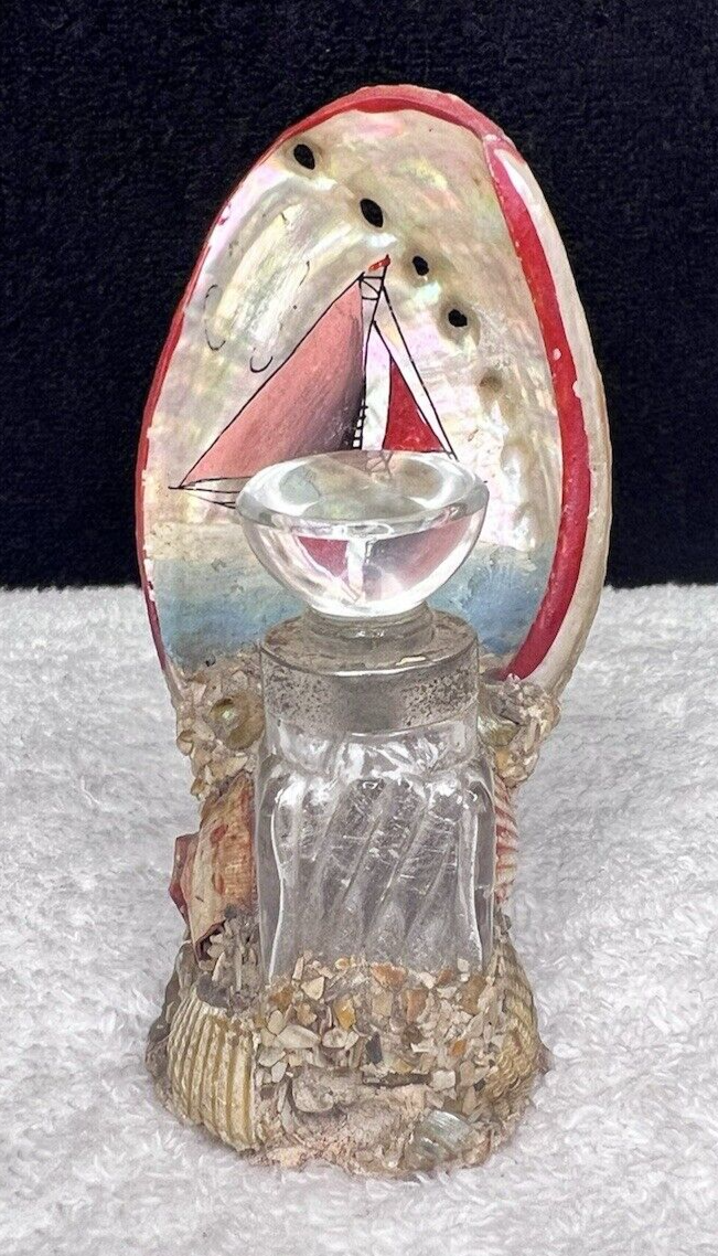 Antique Seashell Art Perfume Bottle Stand w Bottle Hand Painted Sailboat Shell