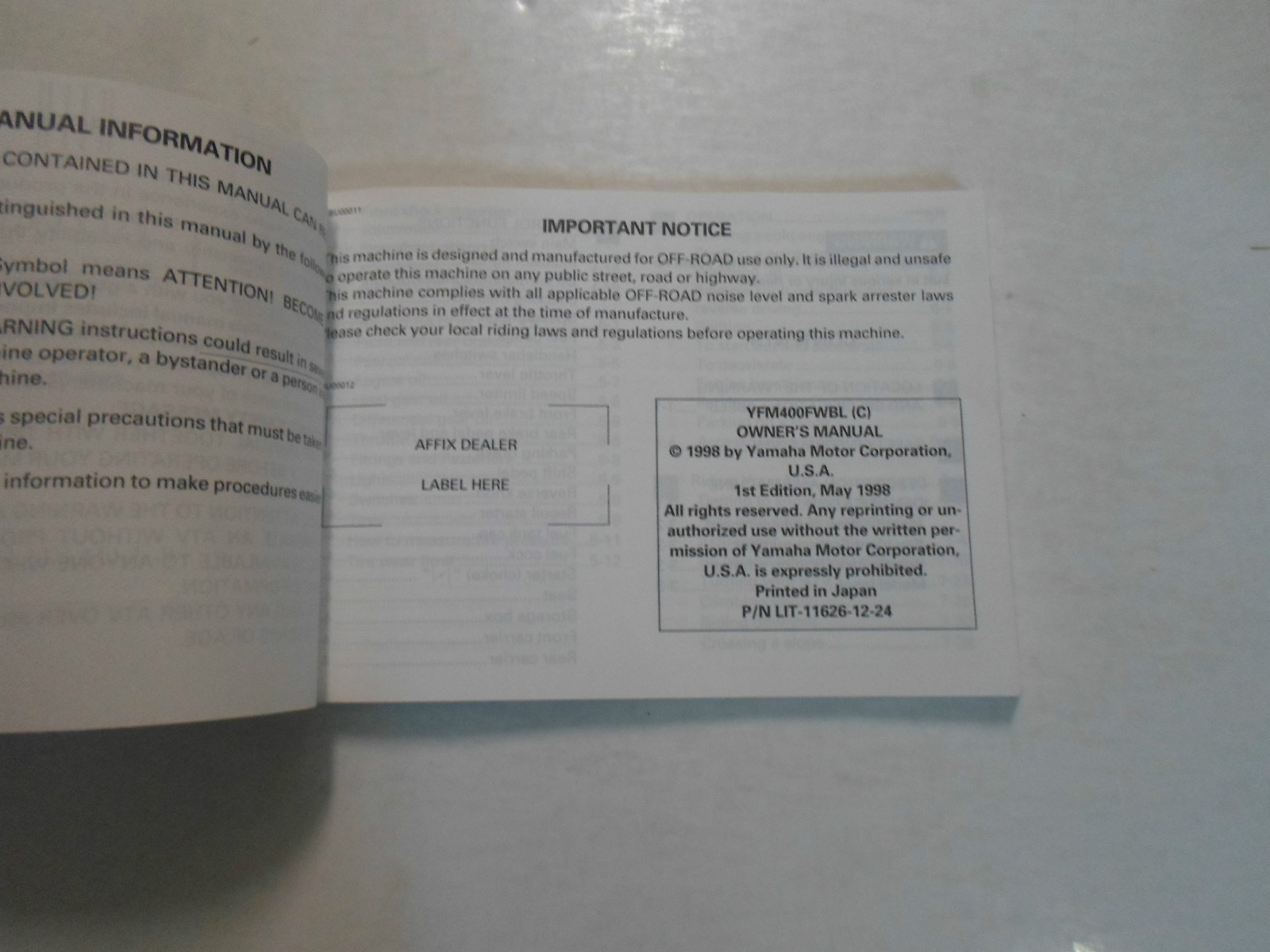 1999 Yamaha 4x4 Kodiak YFM400FWBL (C) Owners Operatori Manuale Fabbrica Nuovo