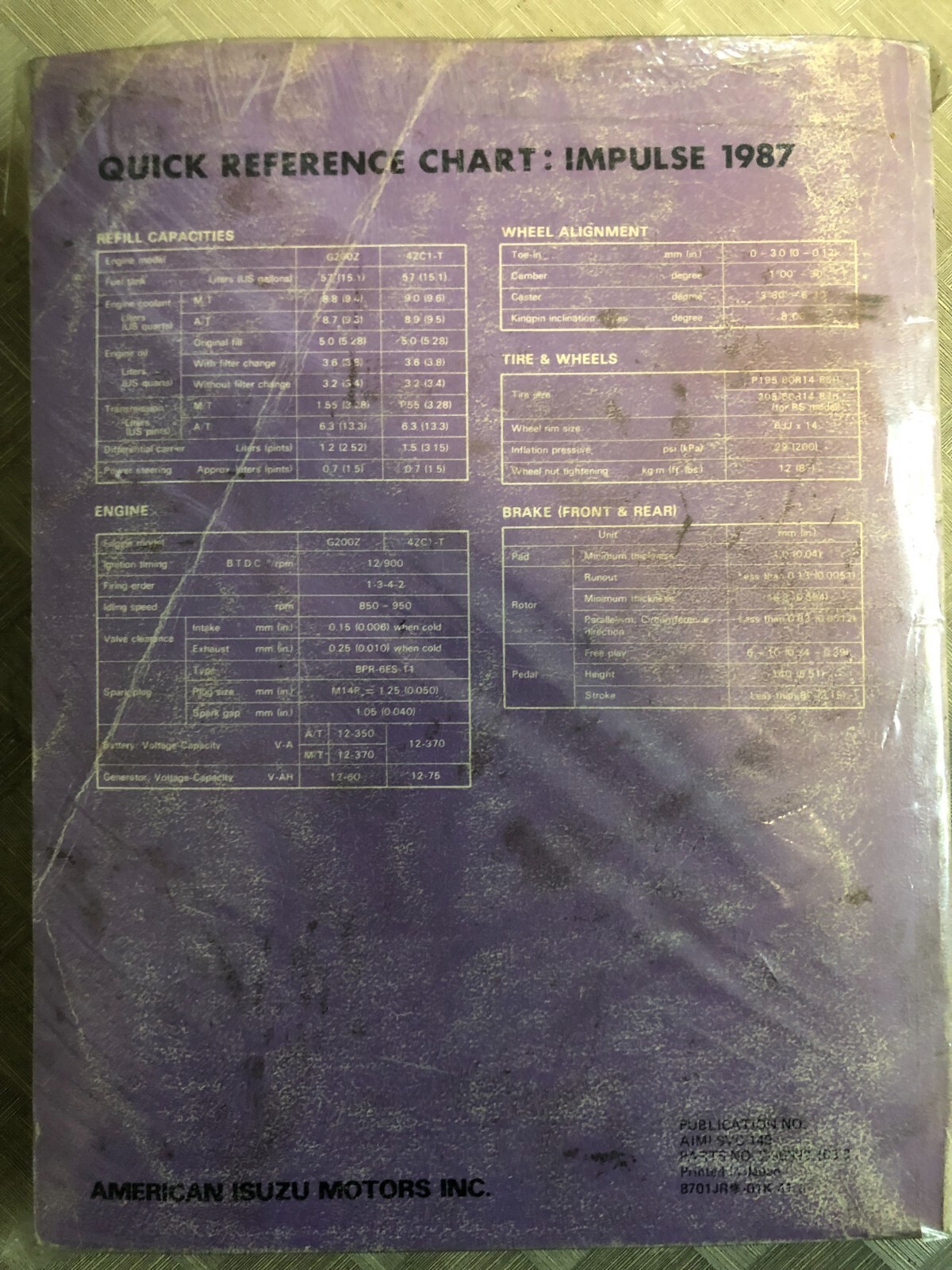 Manuale Di Riparazione E Servizio OEM Isuzu Impulse (JR) 1987 Usato 87