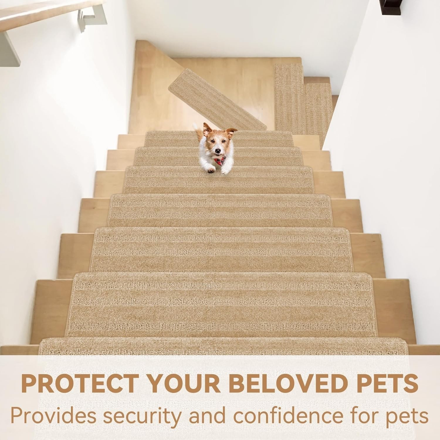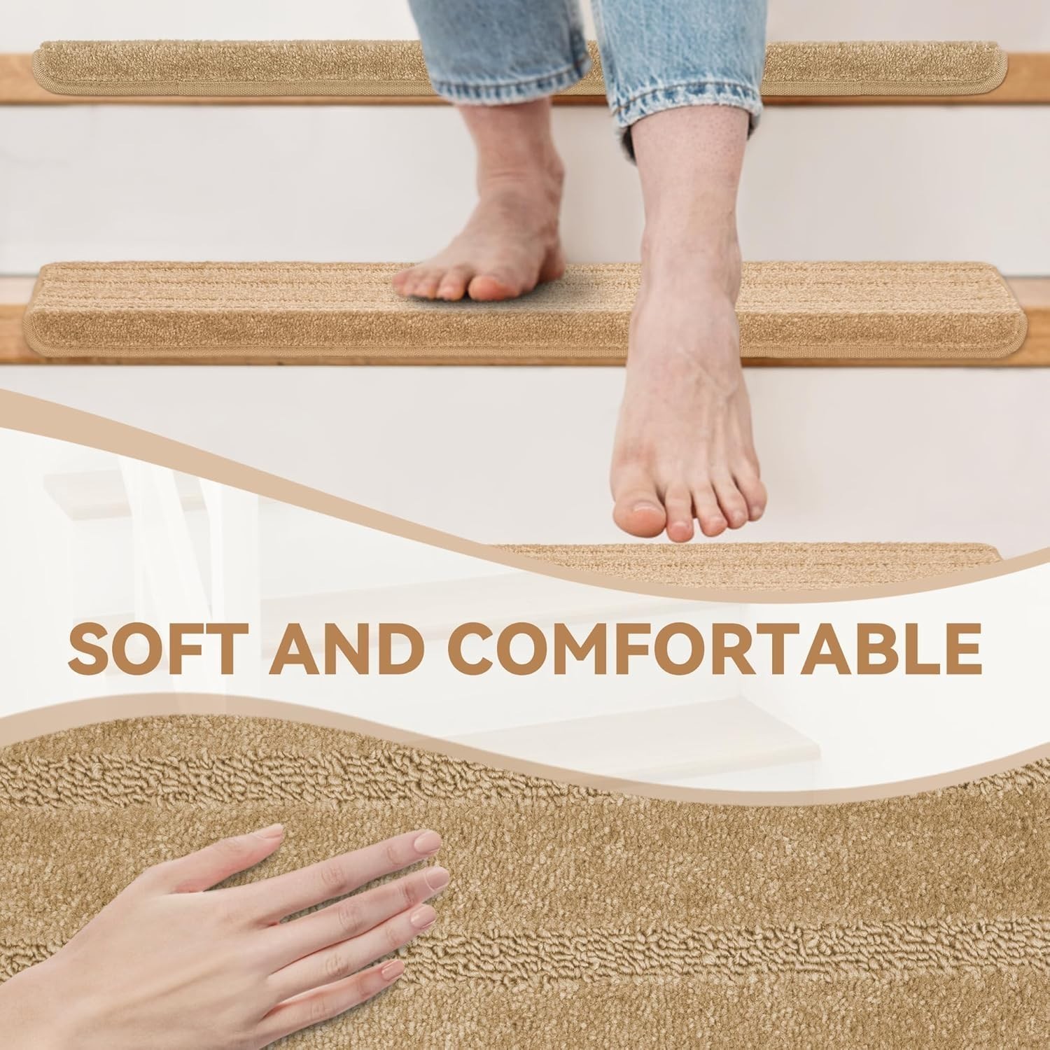 Strong Grip, Ensures Stair Safety ? These non-slip stair treads use a self-adhesive design, ideal for wooden steps, creating a stable surface that won?t shift. Perfect for families with kids, seniors, and pets, these stair carpets offer secure footing for every step with confidence.