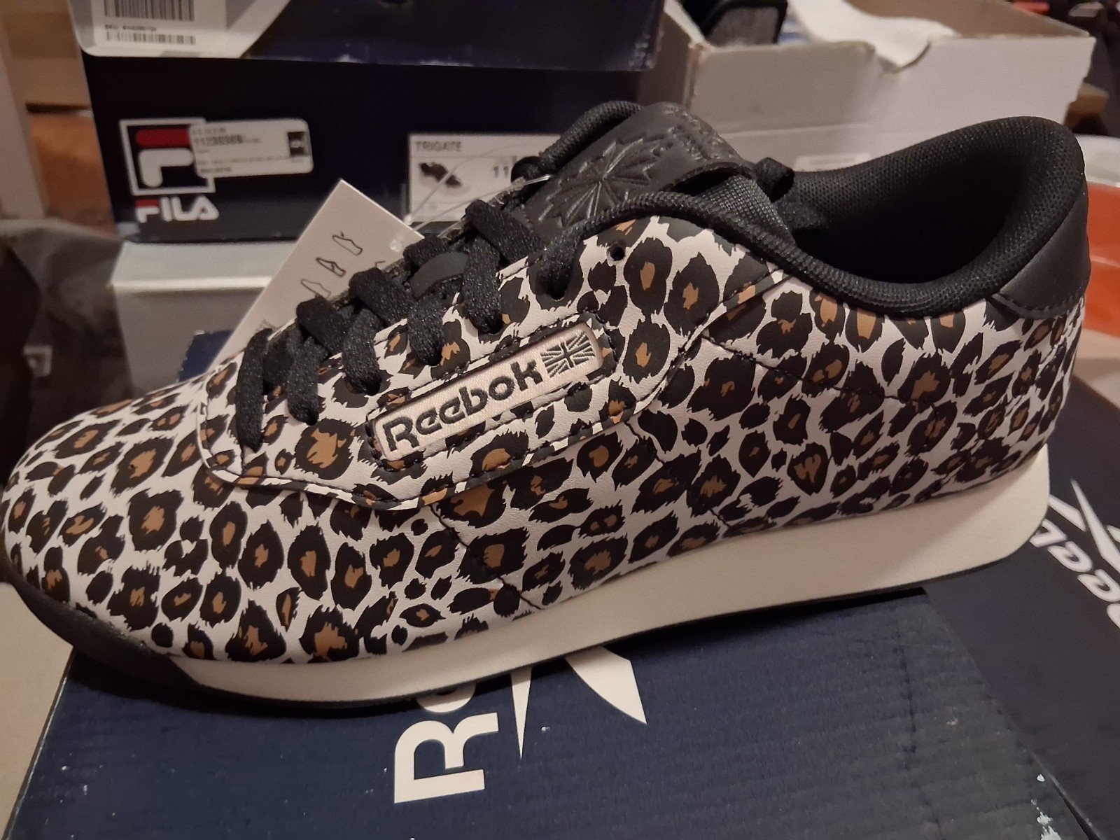 The Reebok Princess Women's Sneakers in size 9M are a stylish and comfortable option for casual and athletic activities. Featuring a low top design with a lace-up closure, these sneakers are adorned with the signature Reebok logo in a vibrant leopard color. Made with rubber cleats for traction and a foam insole for added comfort, these sneakers are perfect for walking and can be worn in various seasons. Representing the Reebok Princess line, these sneakers offer a blend of style and functionality for the modern woman on the go.