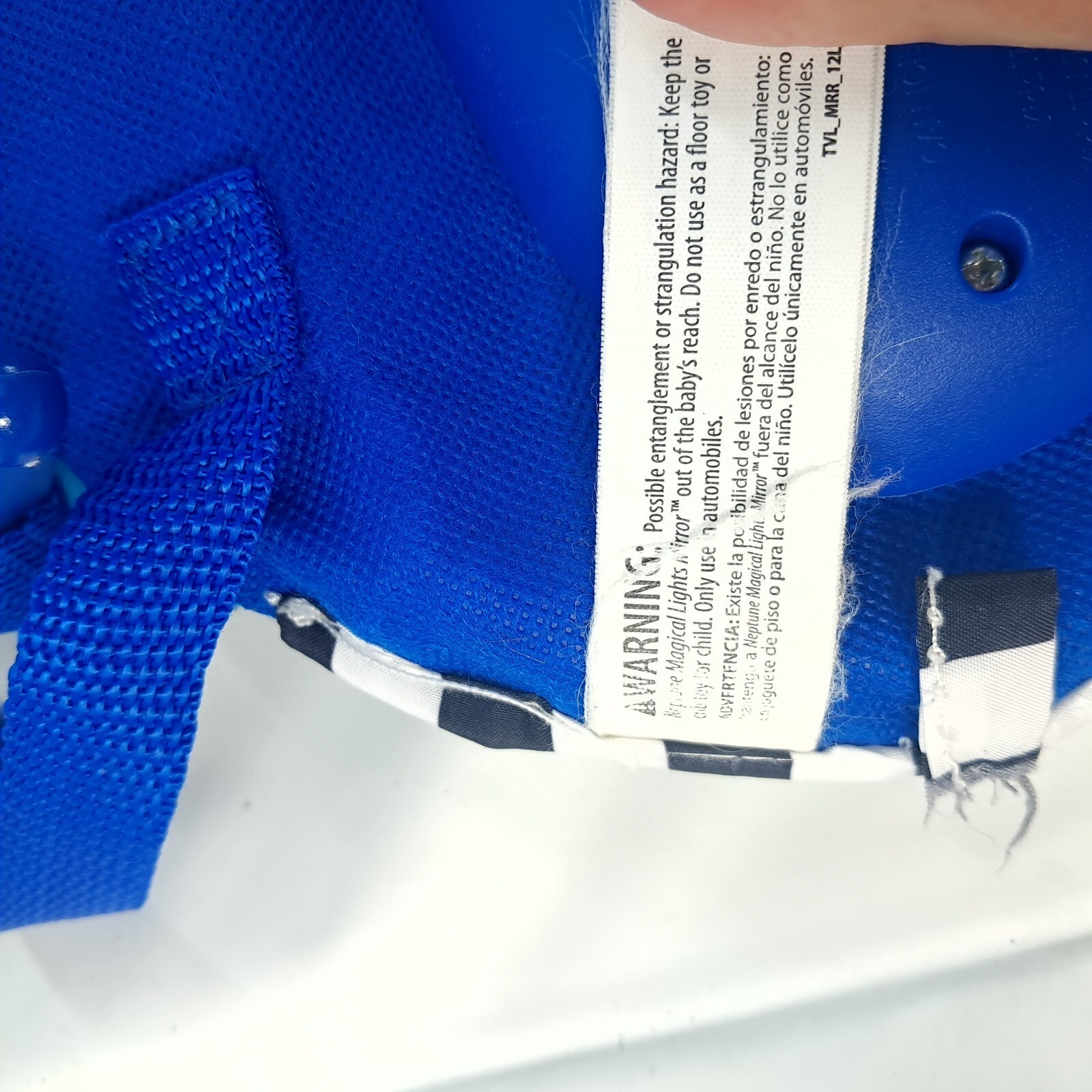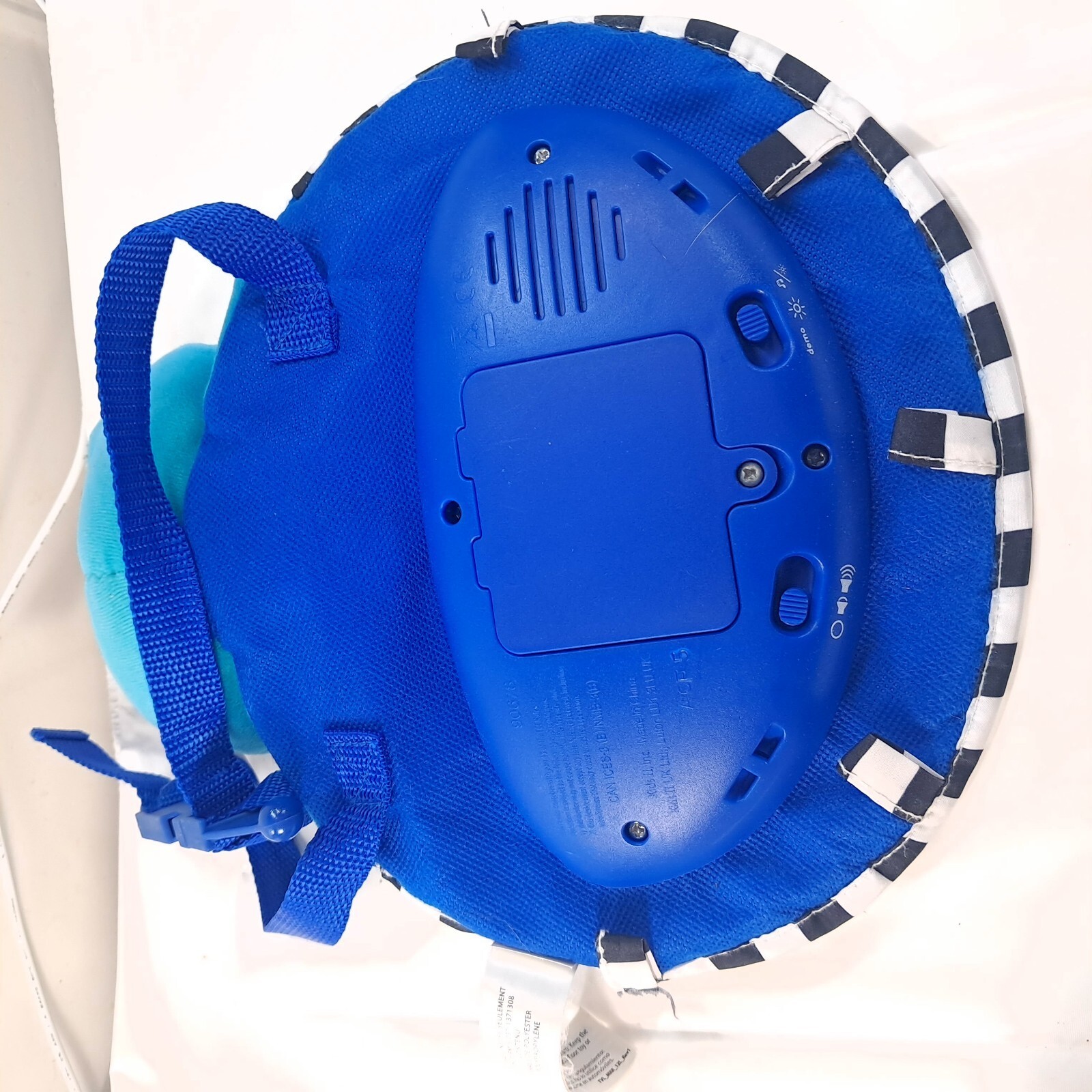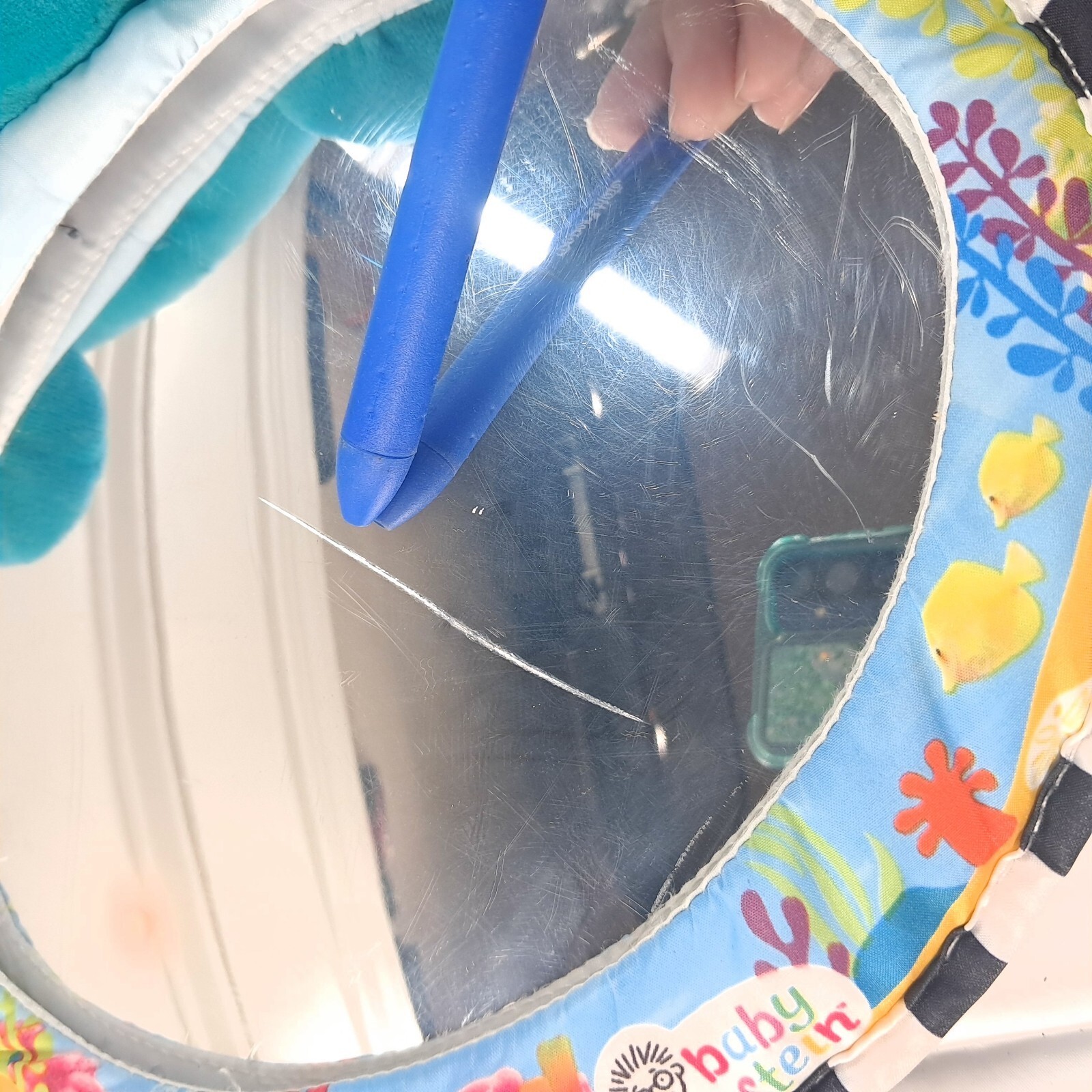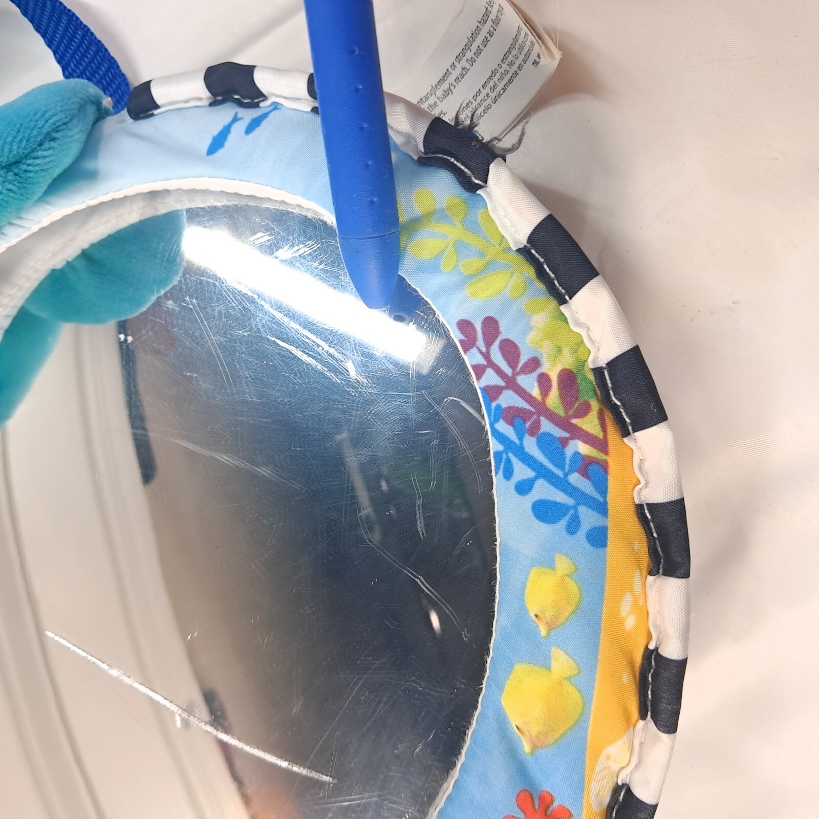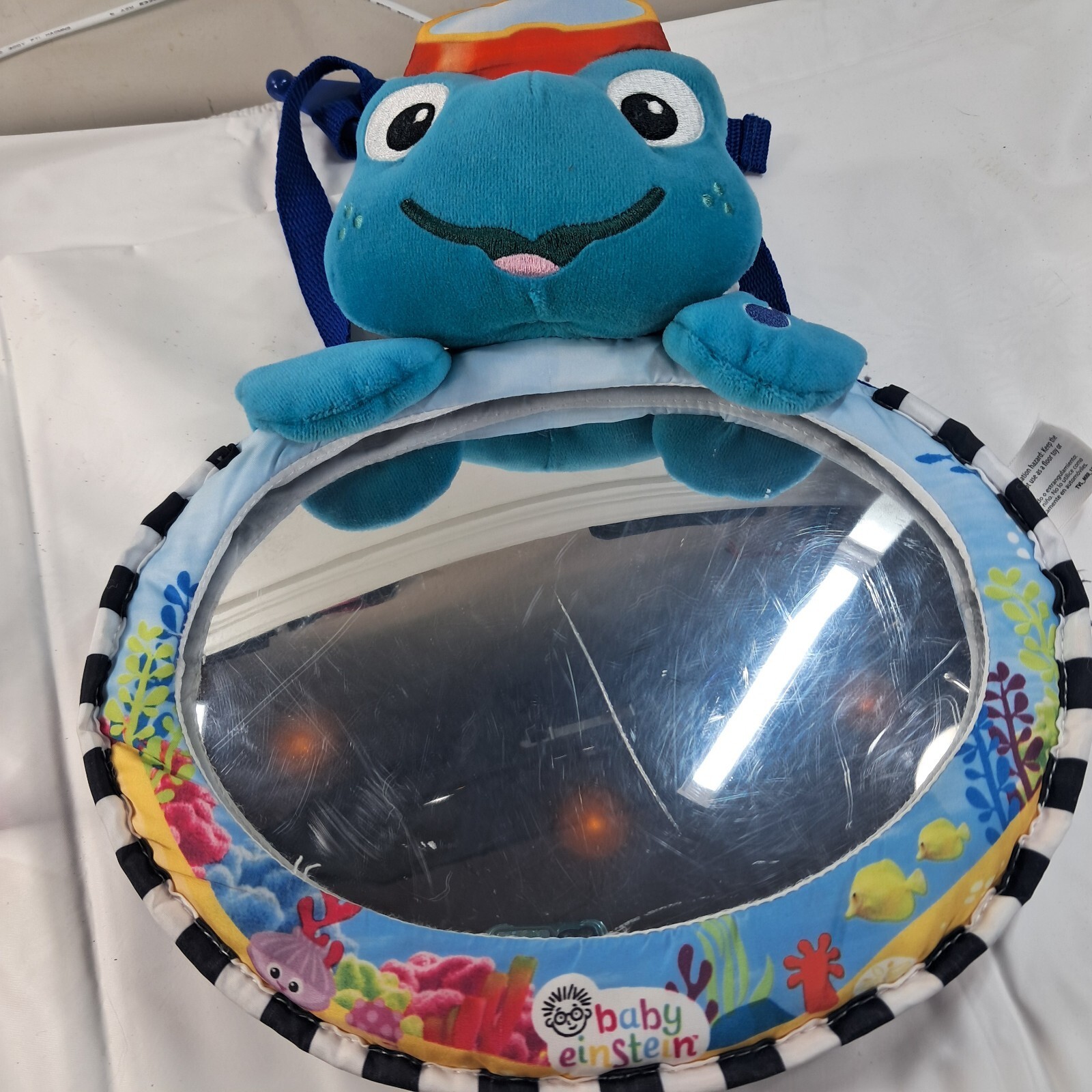 Car seat mirror with lights and music. Mirror is scratched, and there is some discoloration to the turtle on the underside, as shown. Batteries not included.