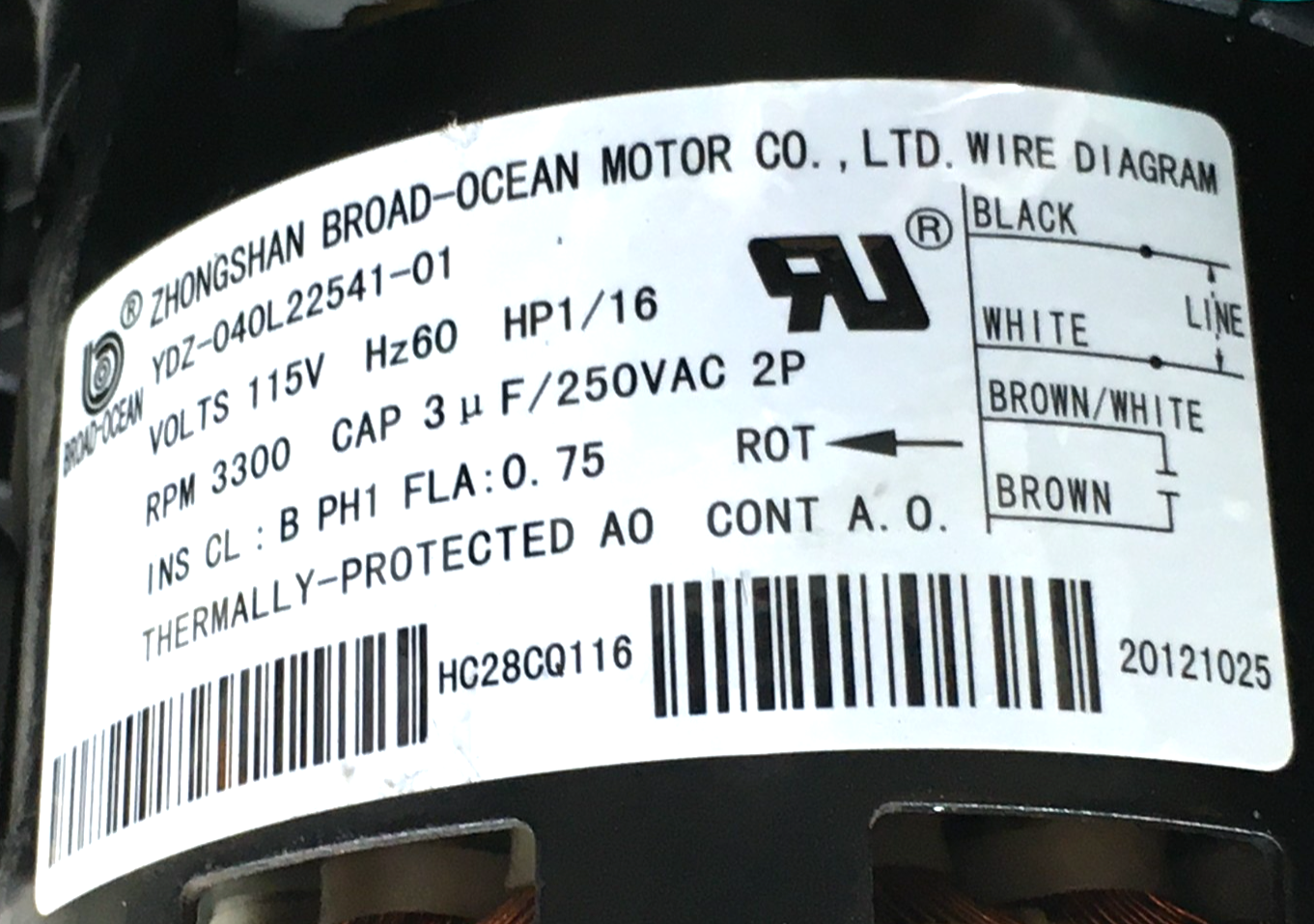 This is Broad-Ocean YDZ-040L22541-01 Furnace Inducer Motor Carrier HC28CQ116 3300RPM 115V 1/16HP 60Hz used part.
