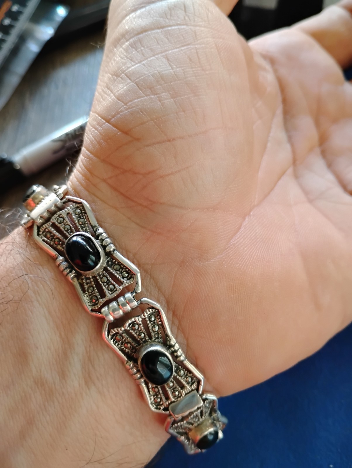 Vintage 925 Sterling Silver Black Onyx Marcasite Stone 7.5 In Bracelet Free Shipping