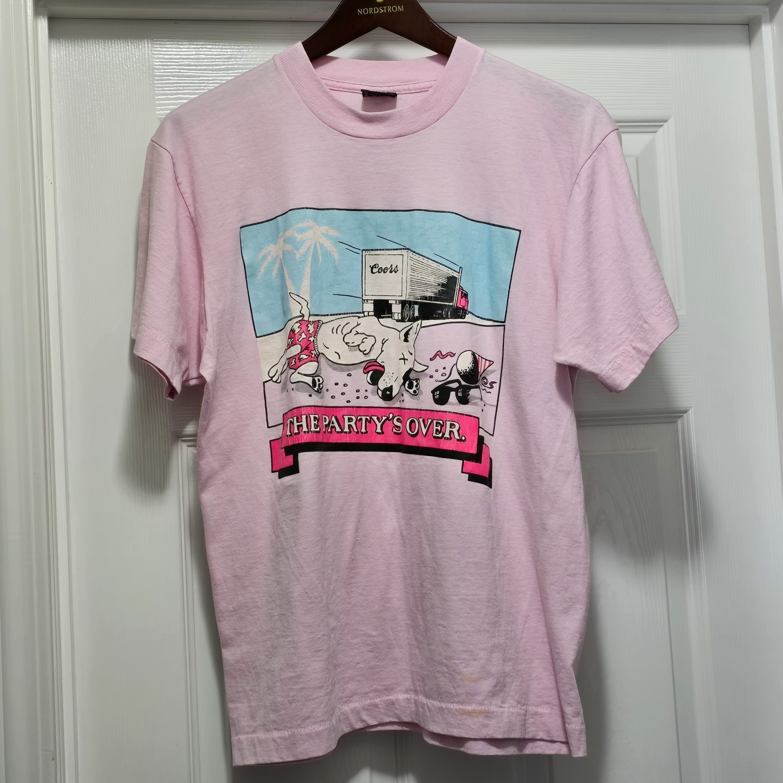 Vintage Coors Single Stitch USA The Party's Over Bud Spud Mackenzie Shirt (Light Pink) Tag Size Large. Fits like a Size Medium. Actual measurements: 40" chest, 25.5" length. Made in USA.