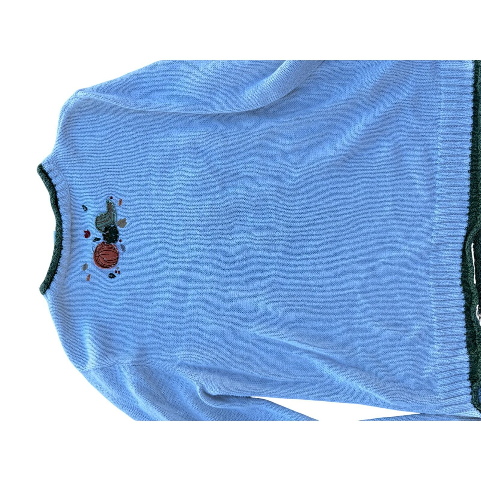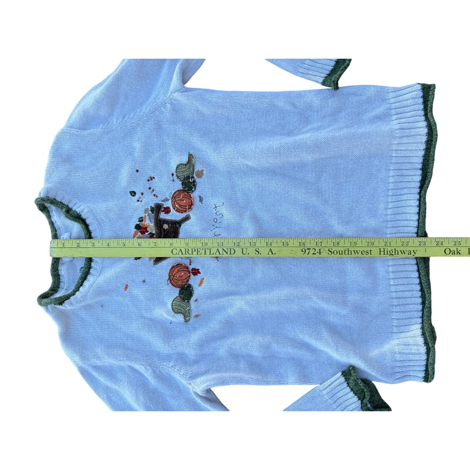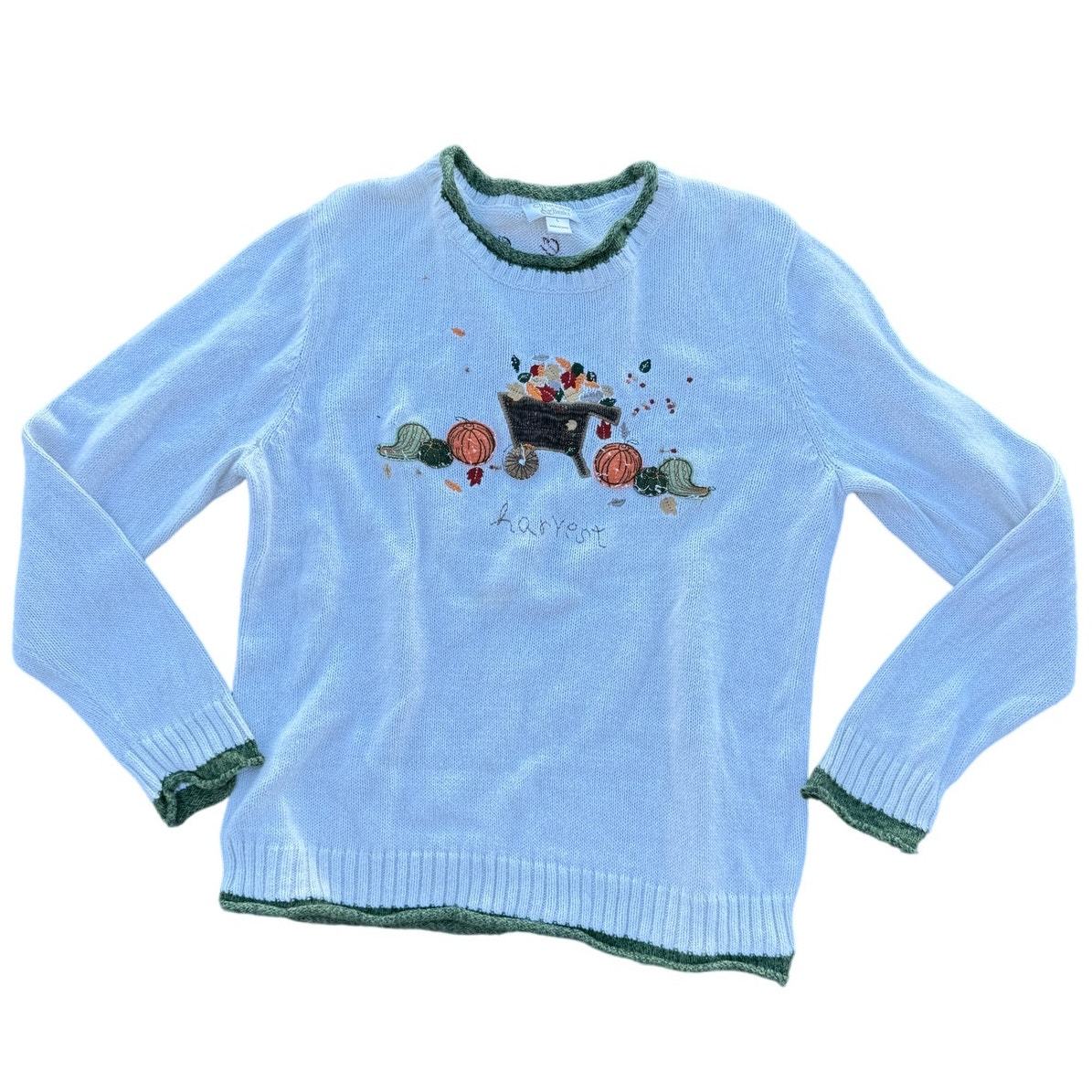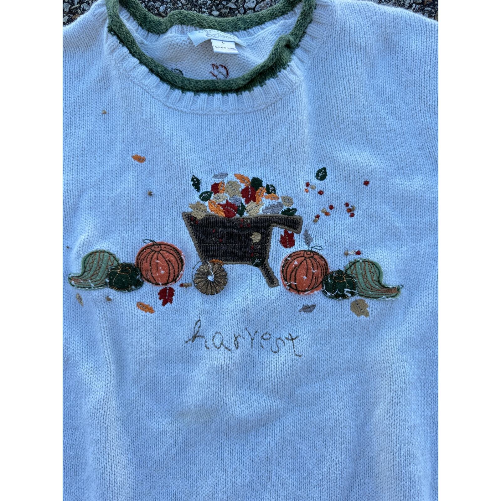 Cozy cream knit sweater with green trim and festive embroidered fall harvest design (pumpkins, wheelbarrow, gourds, and autumn leaves). Material: 55% ramie, 45% cotton. Copyright 2007. Size Large. In good preowned condition with light wear. Perfect for Thanksgiving, fall festivals, or cozy cottagecore styling.