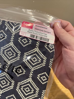 This Thirty-One Studio One Flap bag features a beautiful AB96 Dotty Hexagon pattern in blue and cream. The bag has a hexagon shape and a silver zip closure. The exterior is made of cotton and the hardware color is silver. This crossbody bag is perfect for women who want to stay organized while looking stylish. It is new and has never been used.