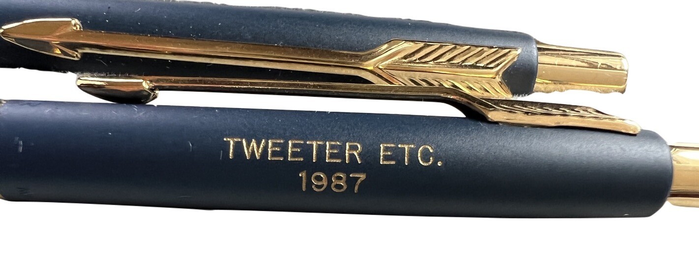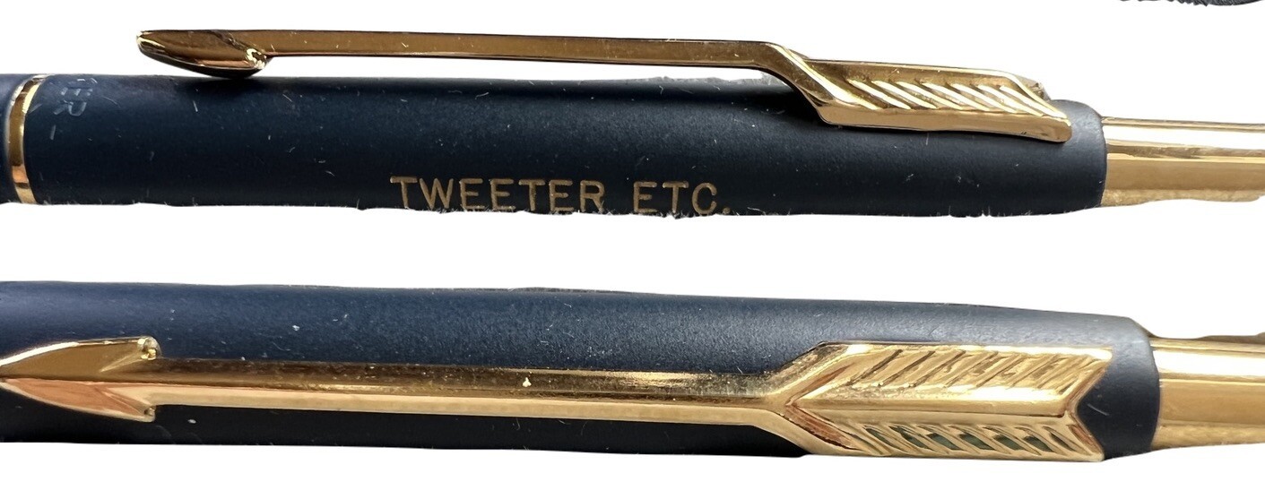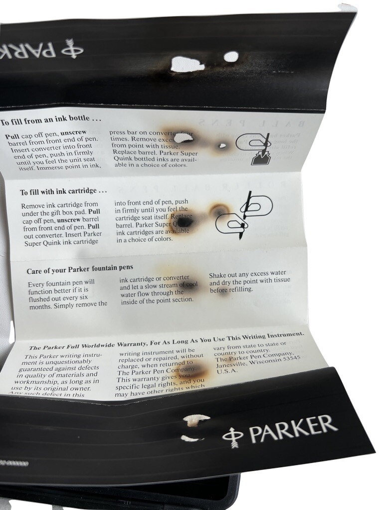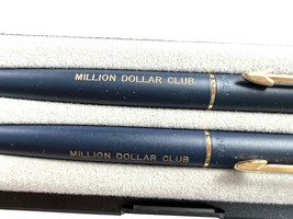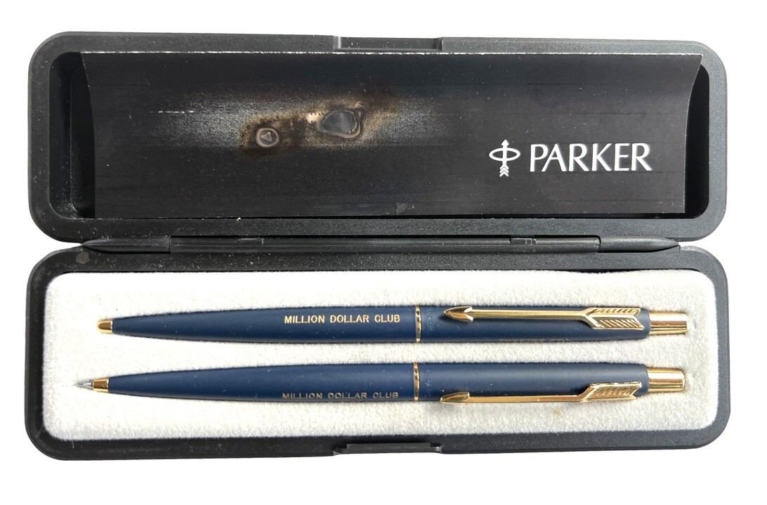 The Parker pen and pencil set is like new, however the enclosed pamphlet has a burn hole it it. Which is also on the top of the case. The pens, though, are mint. They have " Million Dollar CLub " and Tweeter, etc stamped on them.