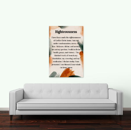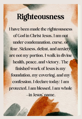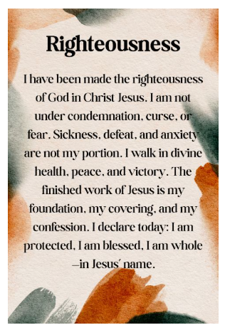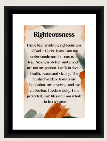 You have been made the righteousness of God in Christ Jesus. This printable declaration is more than decor—it’s a daily spiritual shield. Speak it aloud to remind your heart and your household that sickness, fear, and defeat are not your portion. You are covered, protected, and victorious through the finished work of Jesus.