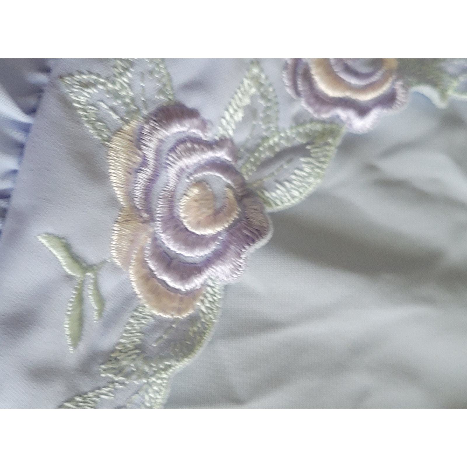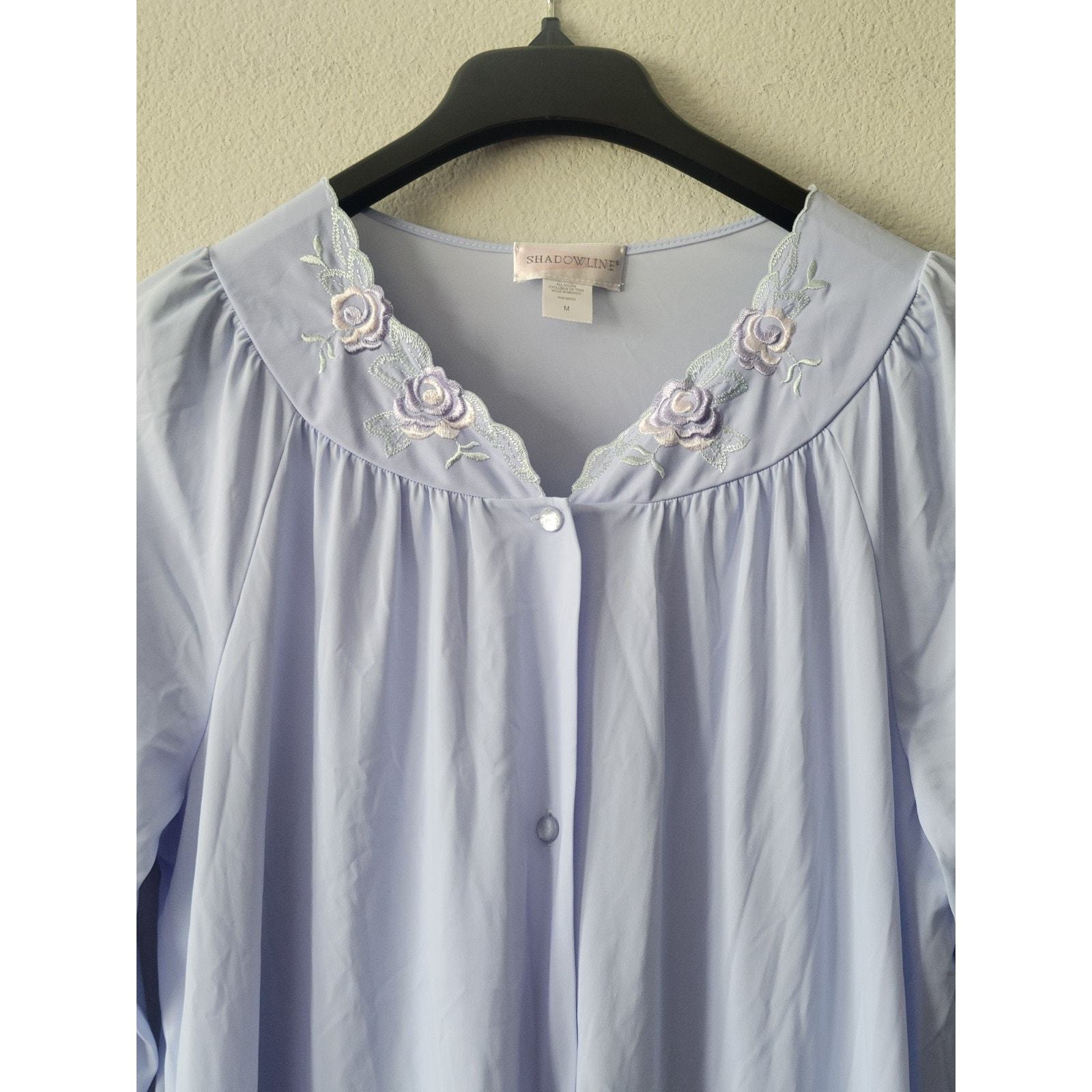 The ShadowLine Long Sleeve Button Down Robe in blue, size medium, is a stylish and comfortable piece of sleepwear for women. Made of nylon fabric with embroidered accents, this robe features a floral pattern and long sleeves, making it perfect for lounging around the house or getting ready for bed. The button closure adds a touch of elegance, while the ShadowLine brand ensures quality and style. This robe is a classic addition to any woman's sleepwear collection, ideal for relaxing in style.