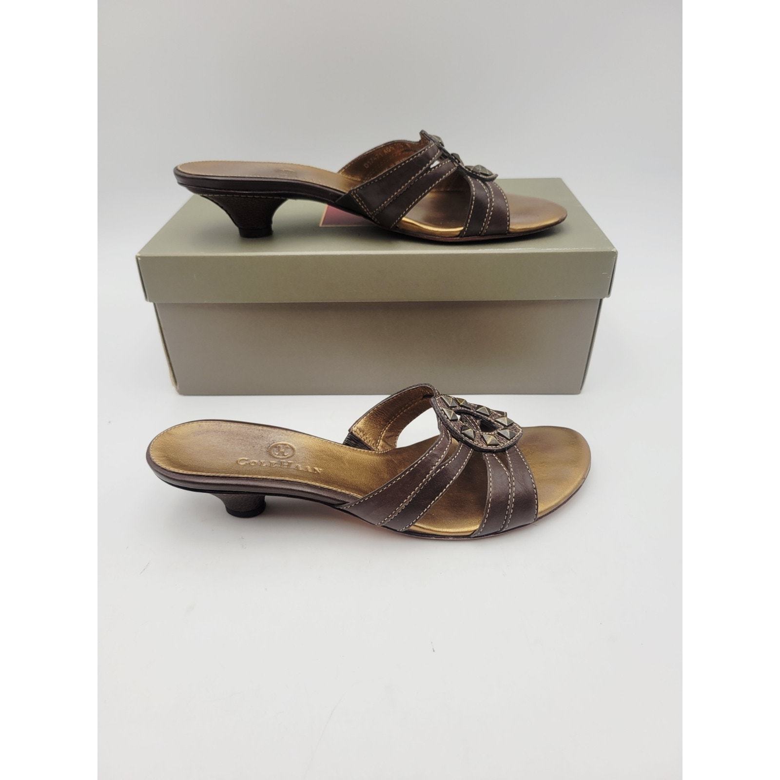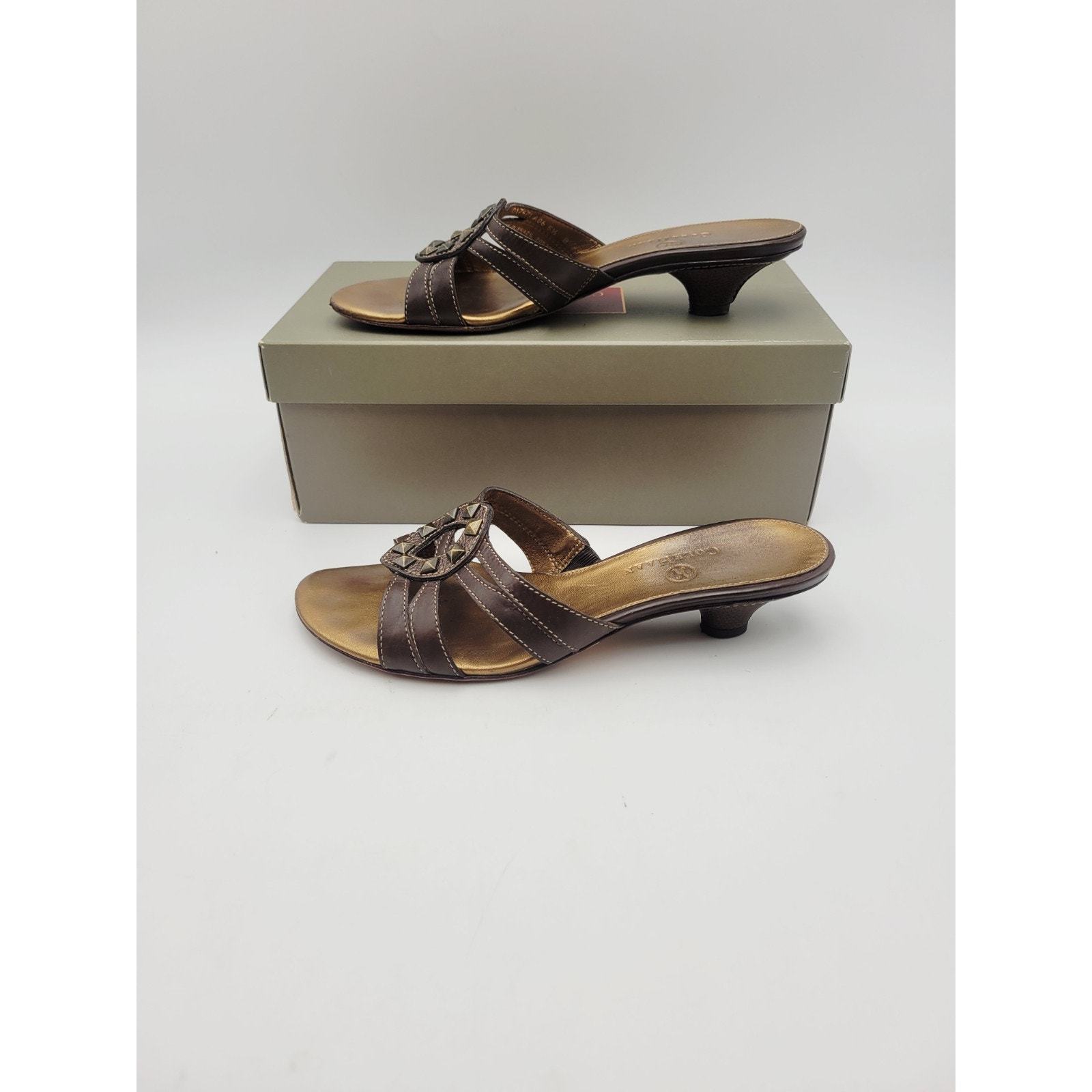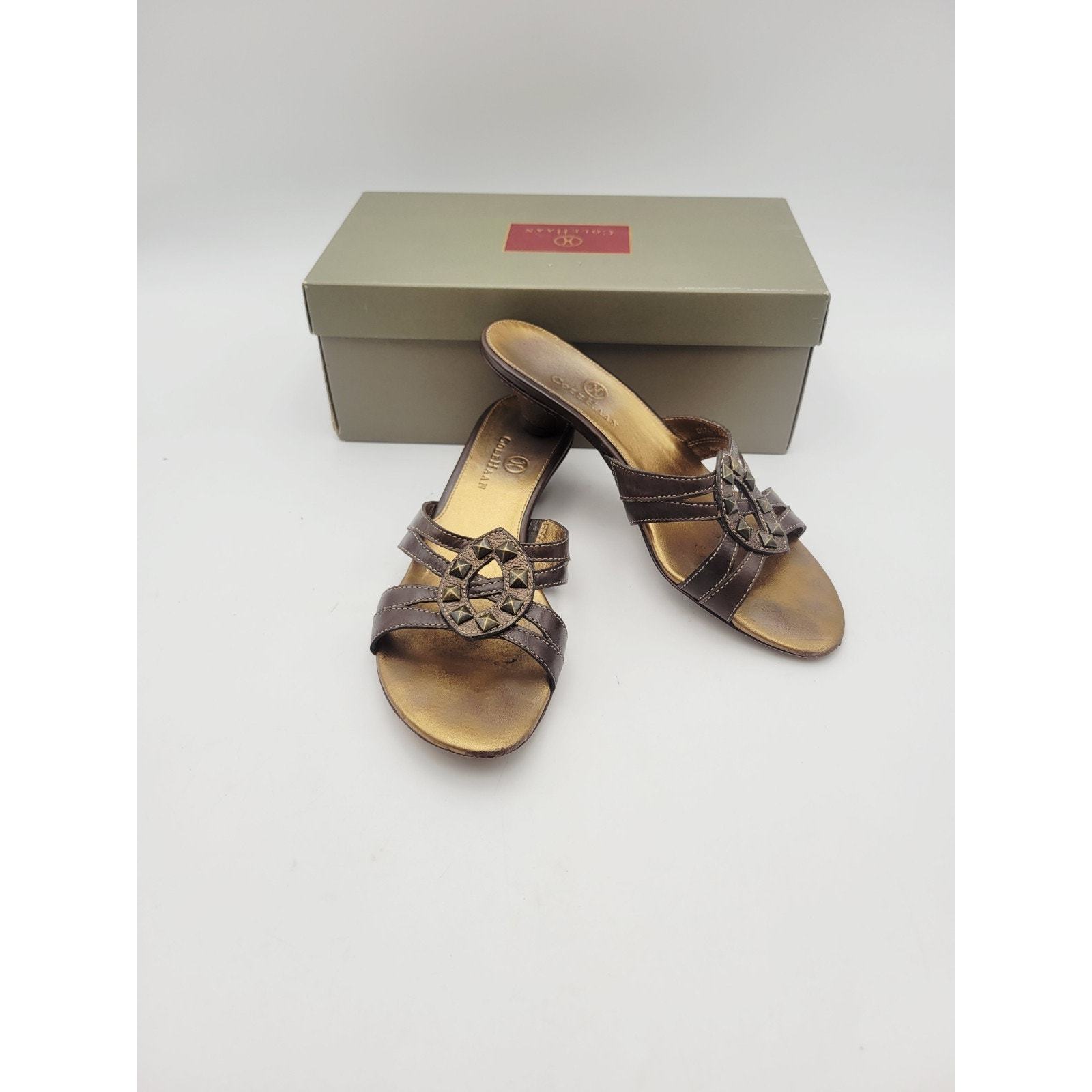 Cole Haan women's brown leather slide mule sandals with studded accents are a stylish and comfortable choice for any occasion, slip-on, 1 1/2 inch heel, and cushioned insole, these sandals are perfect for parties or casual outings. Made of leather with a two-tone pattern, these sandals are versatile for all seasons and showcase the signature Cole Haan brand and style. The American-themed sandals are designed for comfort and are sure to elevate any outfit with their unique design. Made in Brazil, these sandals are a must-have for any fashion-forward woman's wardrobe.