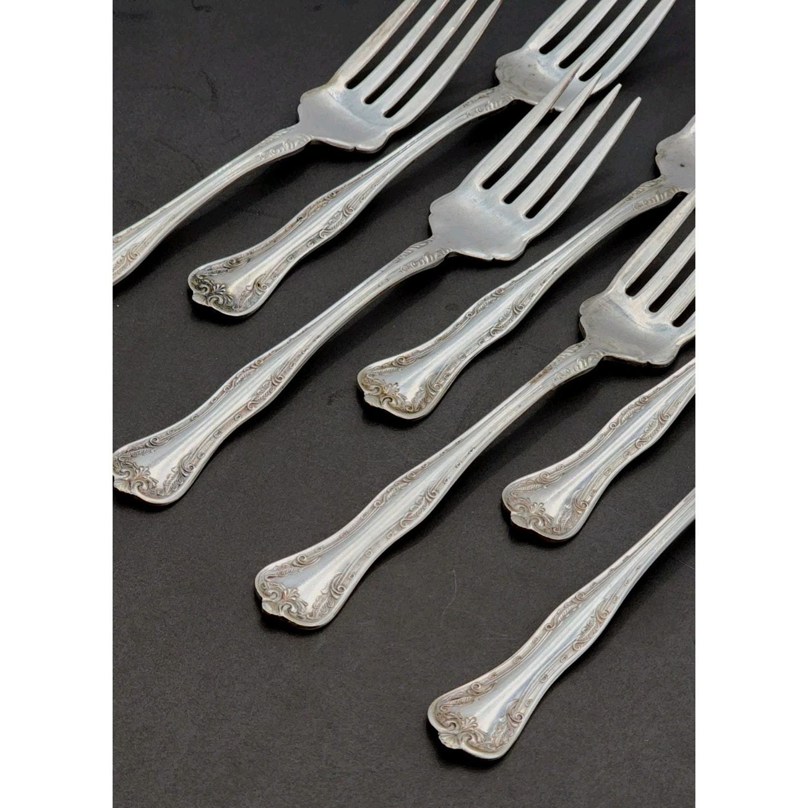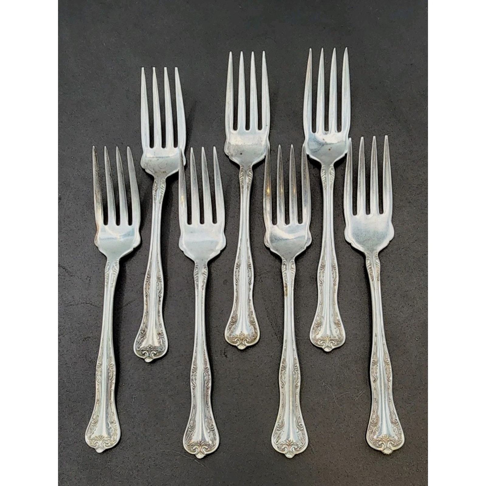 This 7-piece set of salad forks is a beautiful addition to your collection. Made by National Silver Co. in 1908, these forks are crafted from high-quality silverplate and feature the exquisite Queen Elizabeth pattern. The intricate design and fine craftsmanship make them perfect for any formal occasion or collection display.