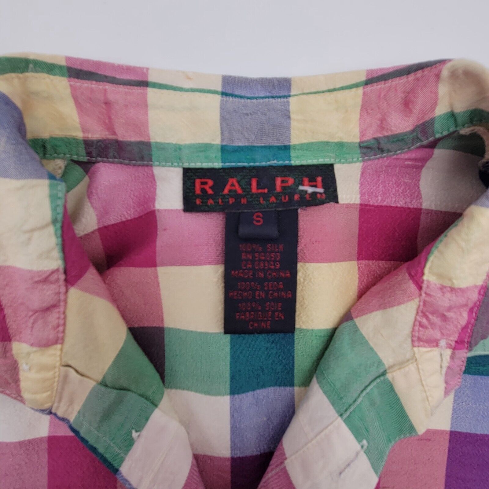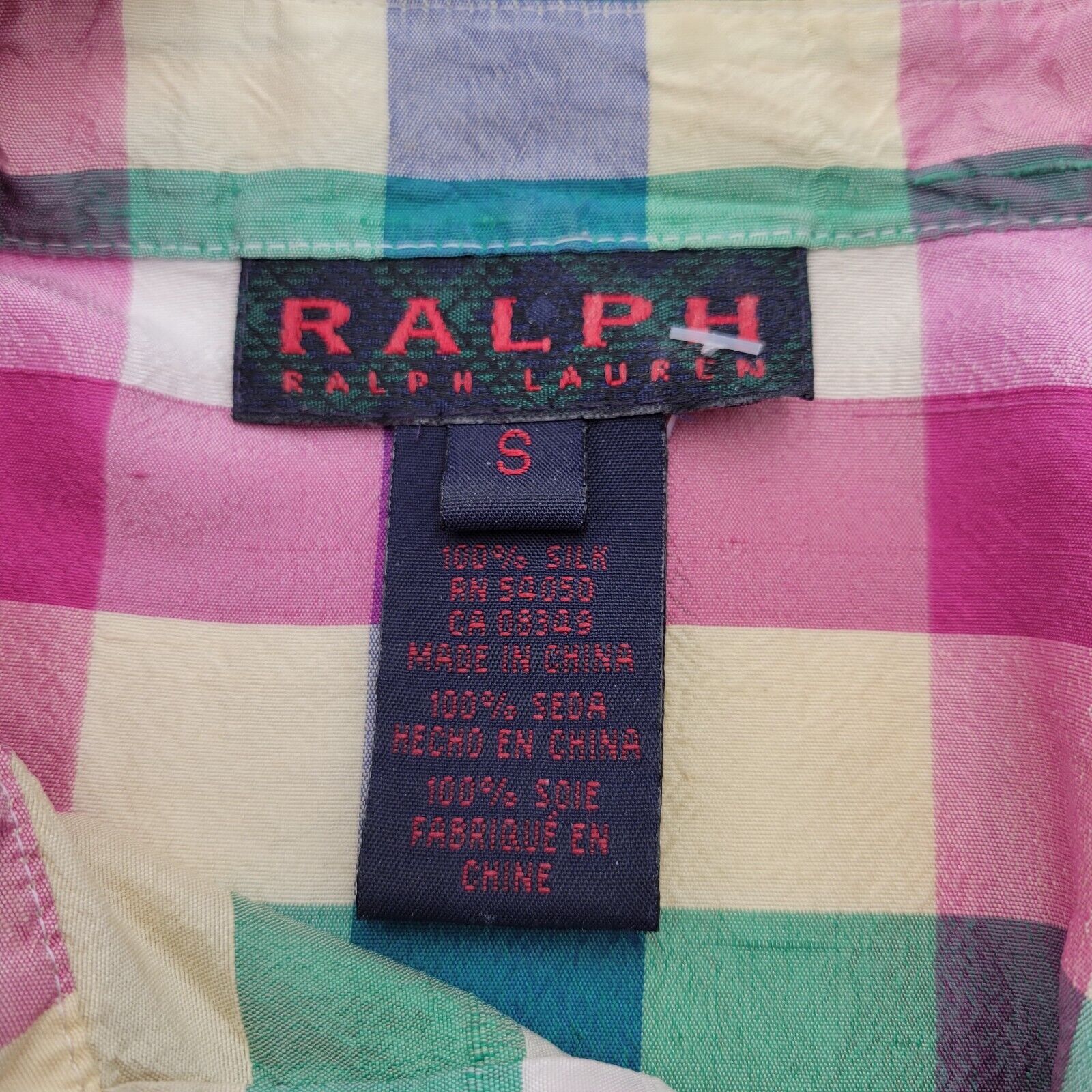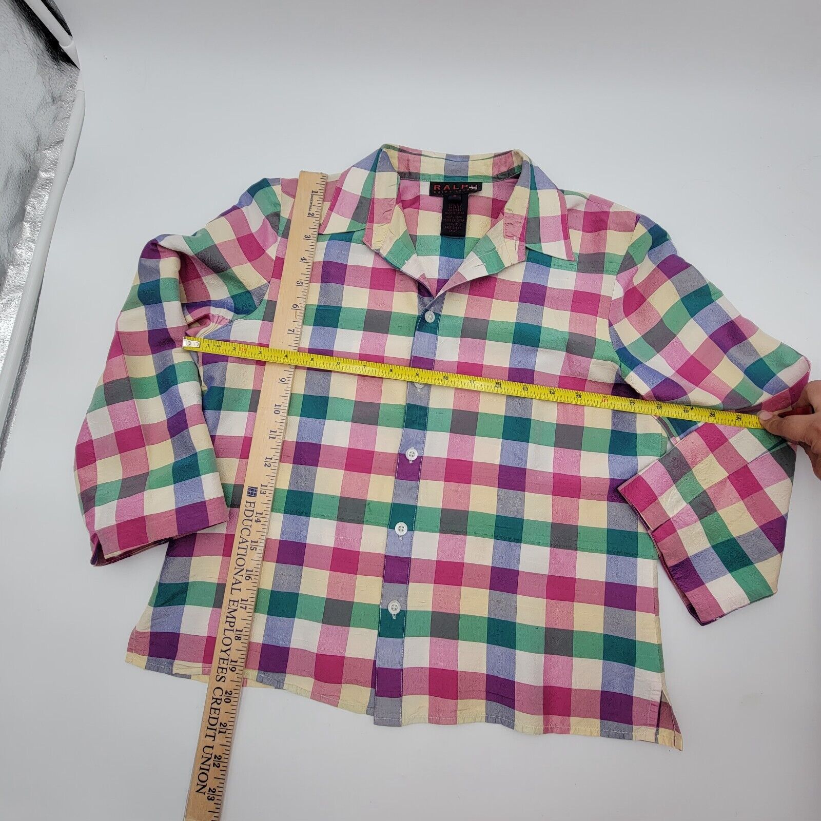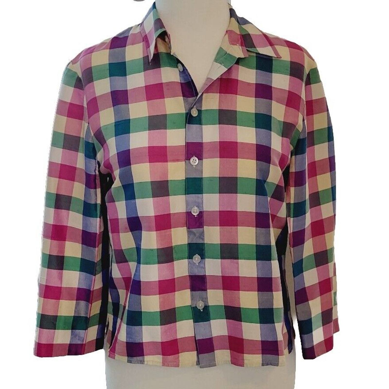 Add a pop of color to your wardrobe with this charming multicolored blouse by Ralph Lauren. Made of 100% silk, this blouse features a collared neckline and 3/4 sleeves, making it perfect for a casual occasion. The plaid and check pattern adds a touch of vintage flair to the blouse, making it a rare find.