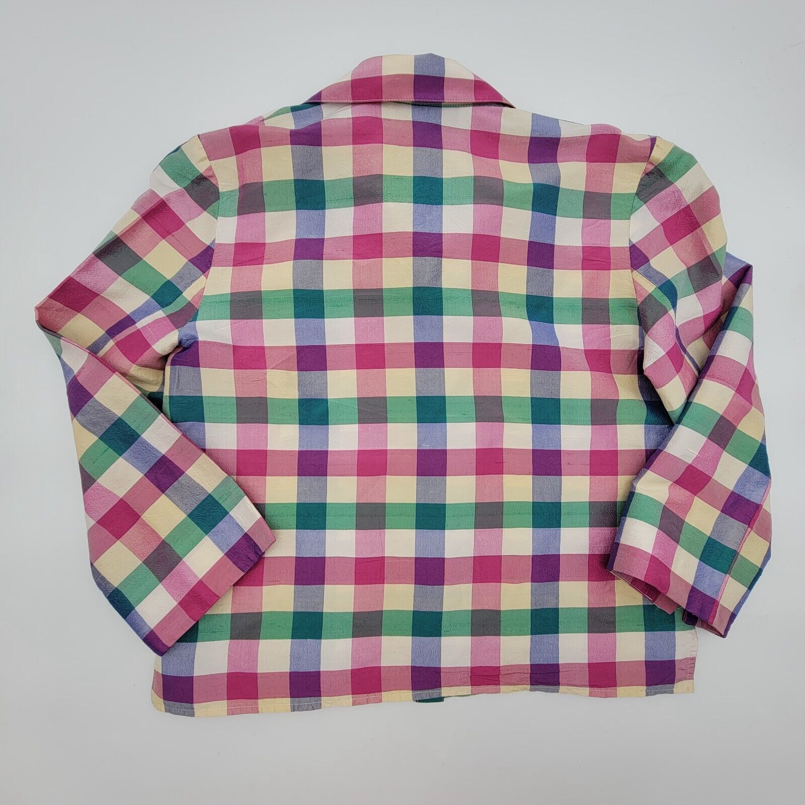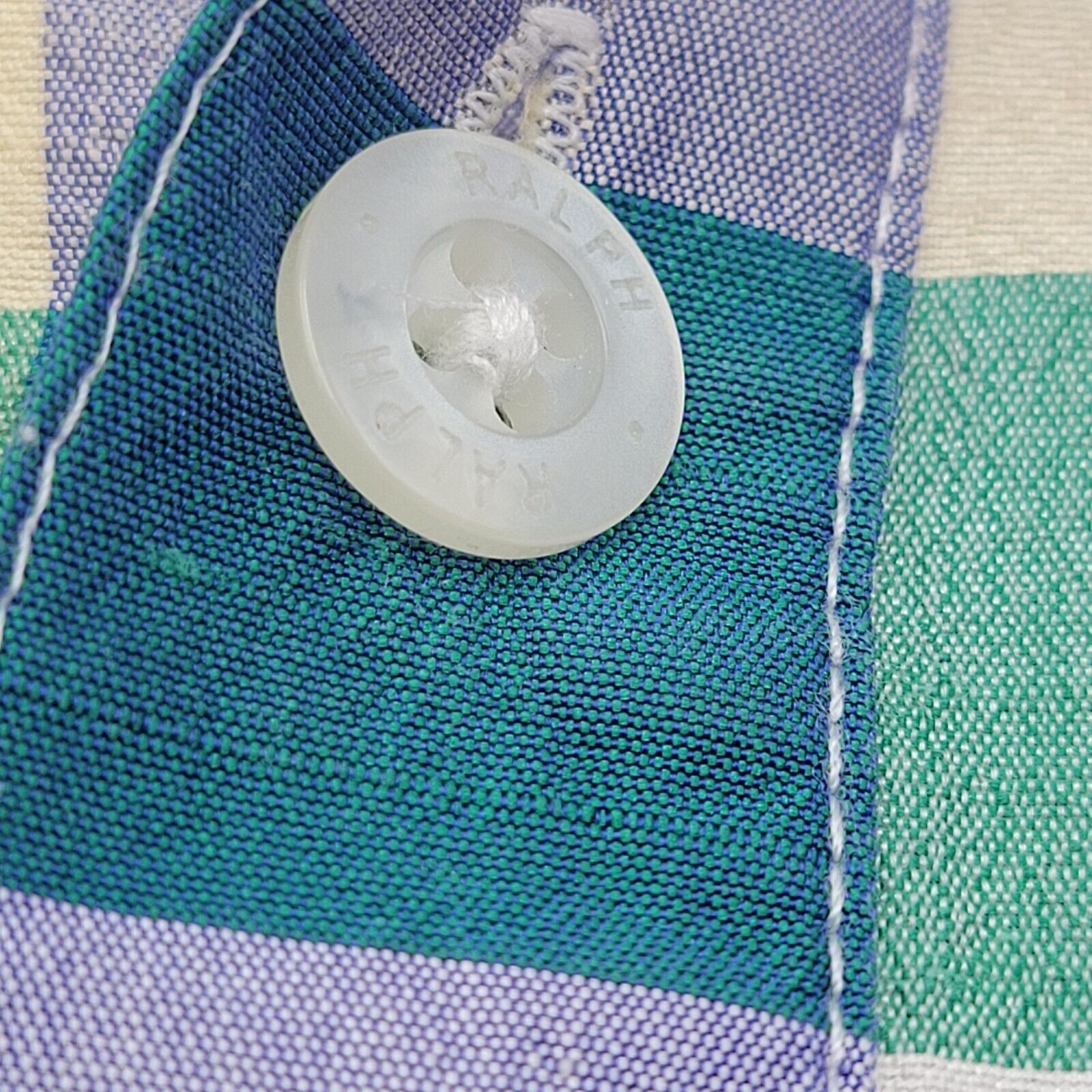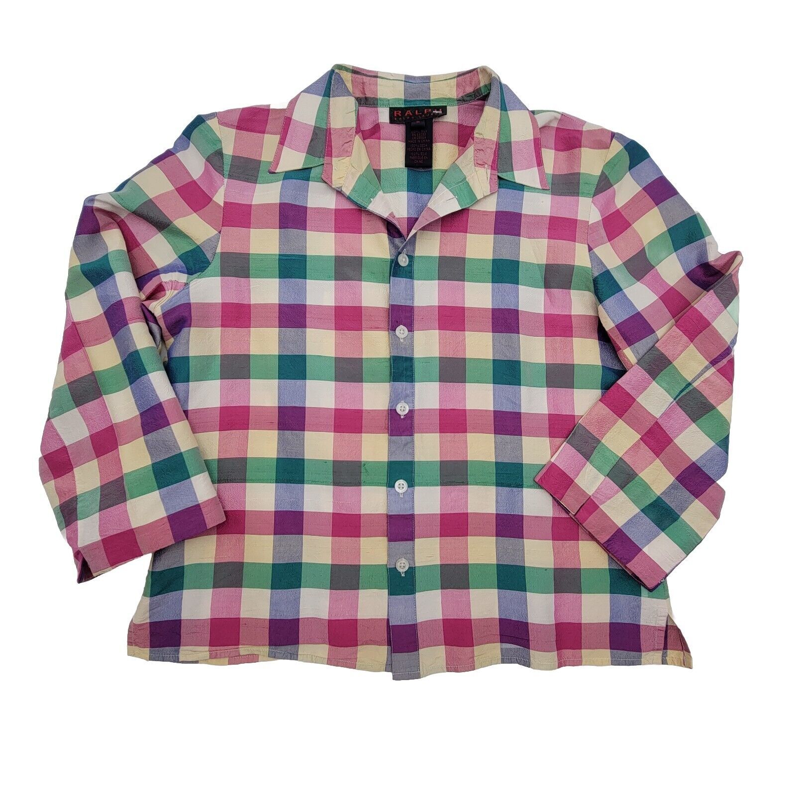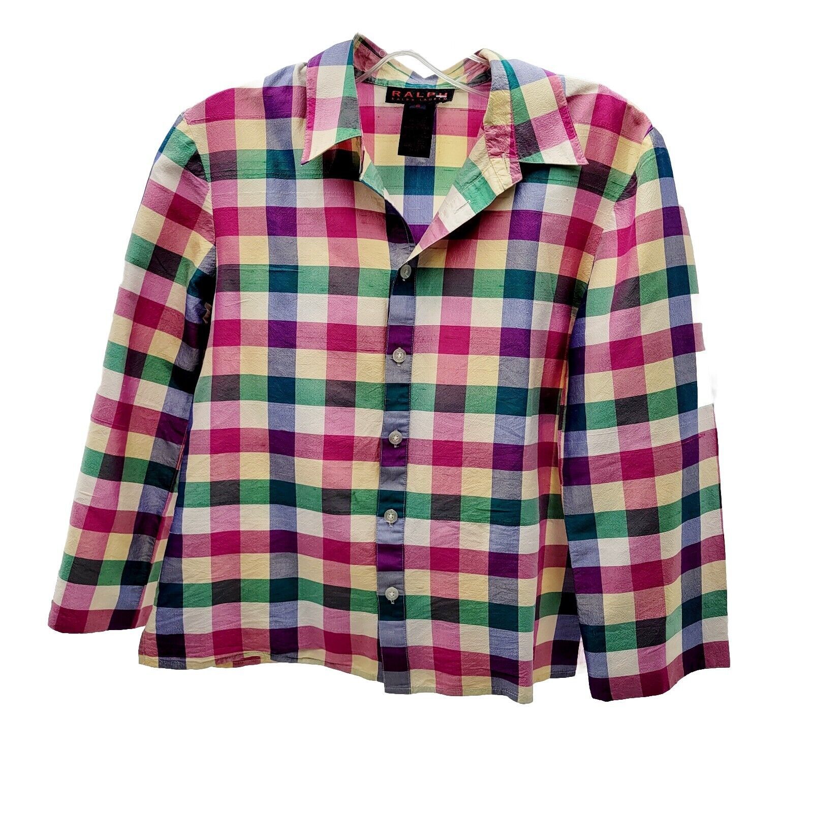 Add a pop of color to your wardrobe with this charming multicolored blouse by Ralph Lauren. Made of 100% silk, this blouse features a collared neckline and 3/4 sleeves, making it perfect for a casual occasion. The plaid and check pattern adds a touch of vintage flair to the blouse, making it a rare find.