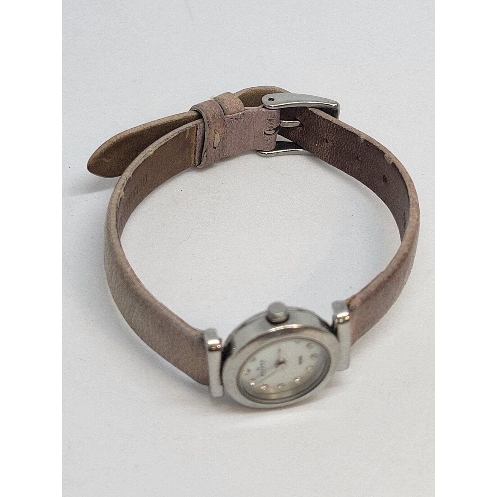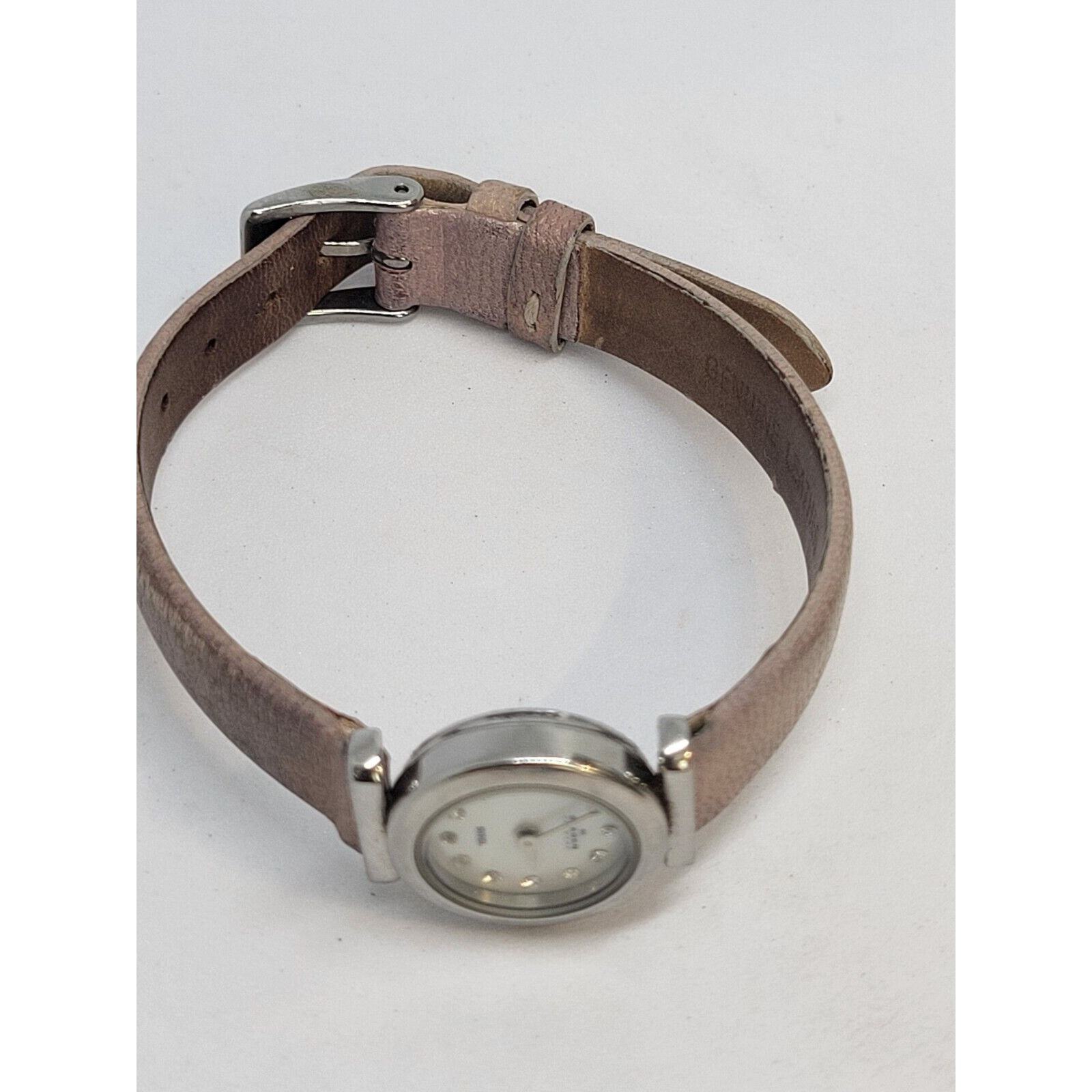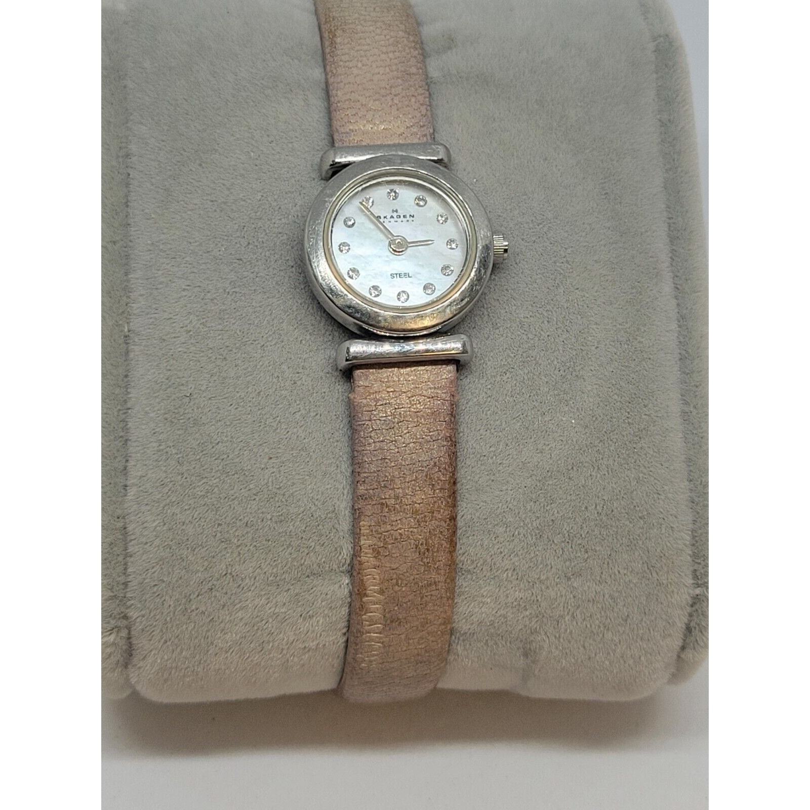 This Skagen Denmark women's watch features a 25mm stainless steel case with a silver bezel and a cream Mother of Pearl dial adorned with diamond markers. The watch has a pink leather two-piece strap and is water-resistant up to 30 meters. It has a classic and casual style, and operates on a new battery. Made in Denmark, this analog wristwatch does not come with papers, original box, or manual.