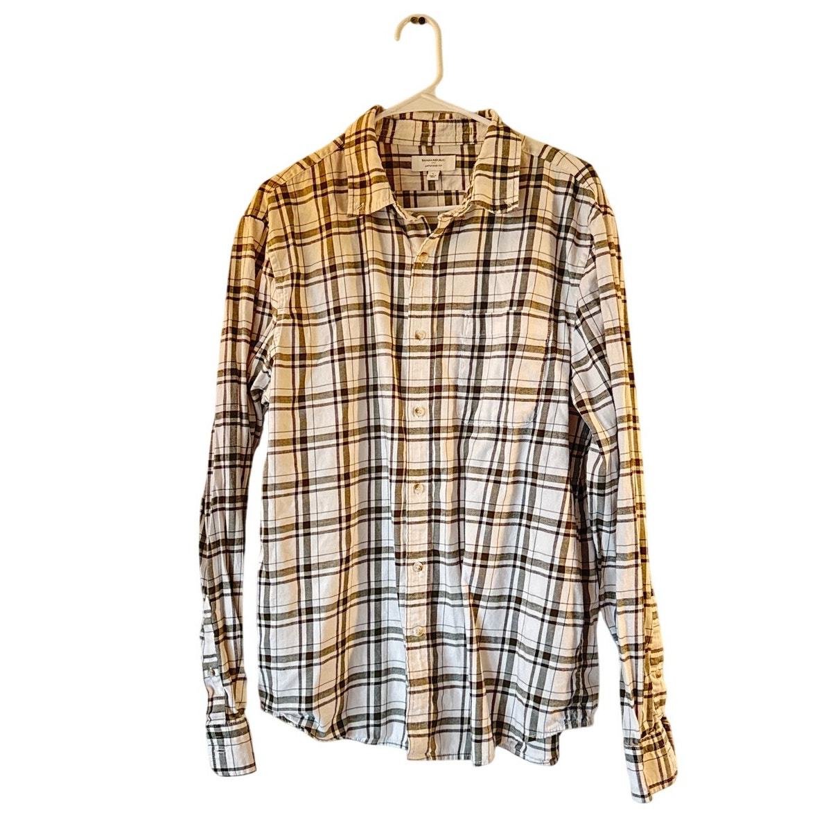 Classic Banana Republic men?s long sleeve button-down shirt in a brown and cream plaid pattern. Designed with the Untucked Fit for a modern, casual look that?s slightly shorter in length. Features button front closure, single chest pocket, and button cuffs. Lightweight and versatile?ideal for layering or wearing on its own.
