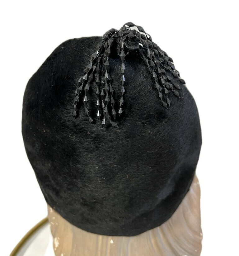 Retro 60s Helios Italy Black Fur Wool Helmet Hat Small Beaded Tassel VTG Mod