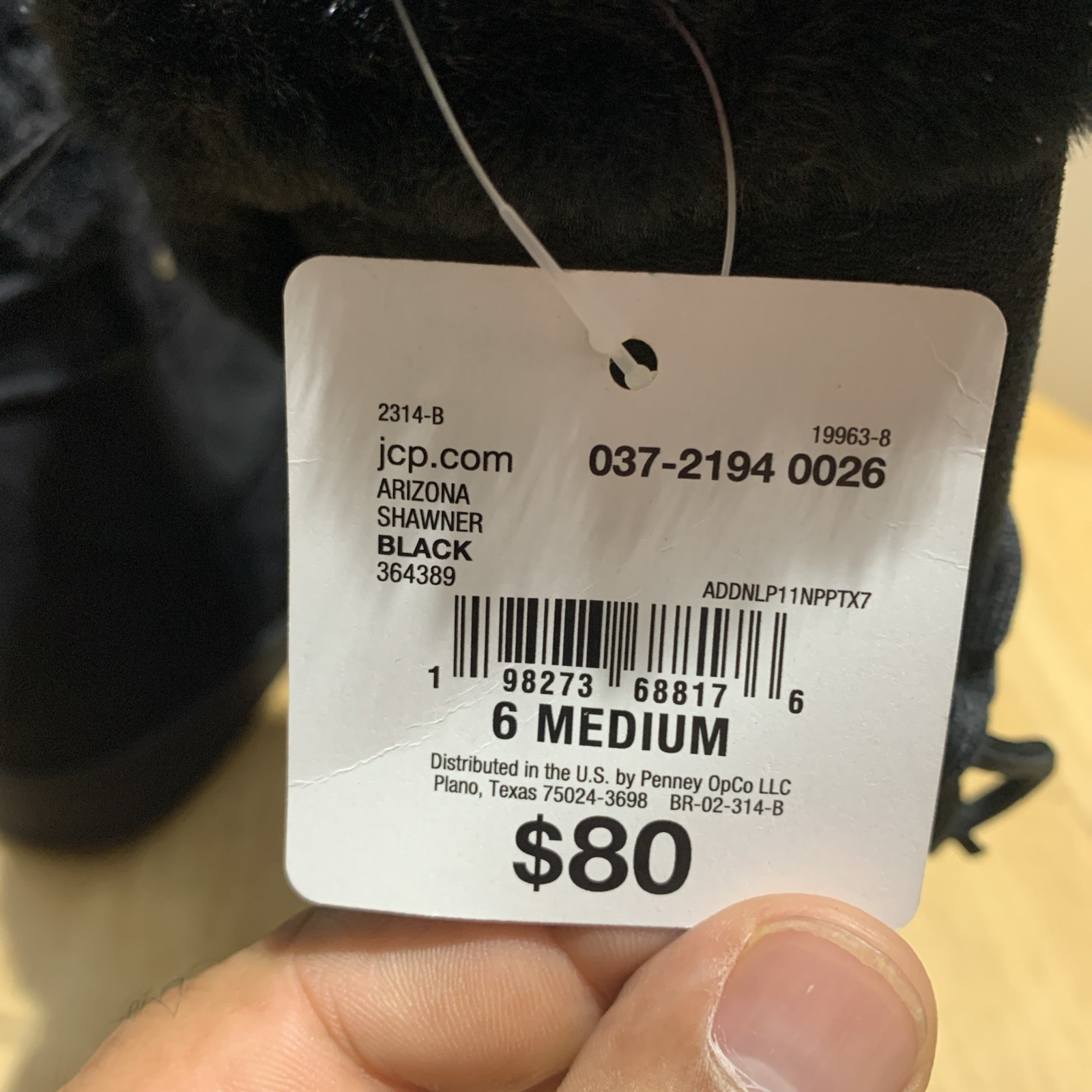The product is a pair of Arizona Jean Co women's black winter boots in size 6M. These slip-on boots feature a flat heel, synthetic upper material, and are designed specifically for the winter season. Made in China, the boots offer a stylish and comfortable option for cold weather wear.