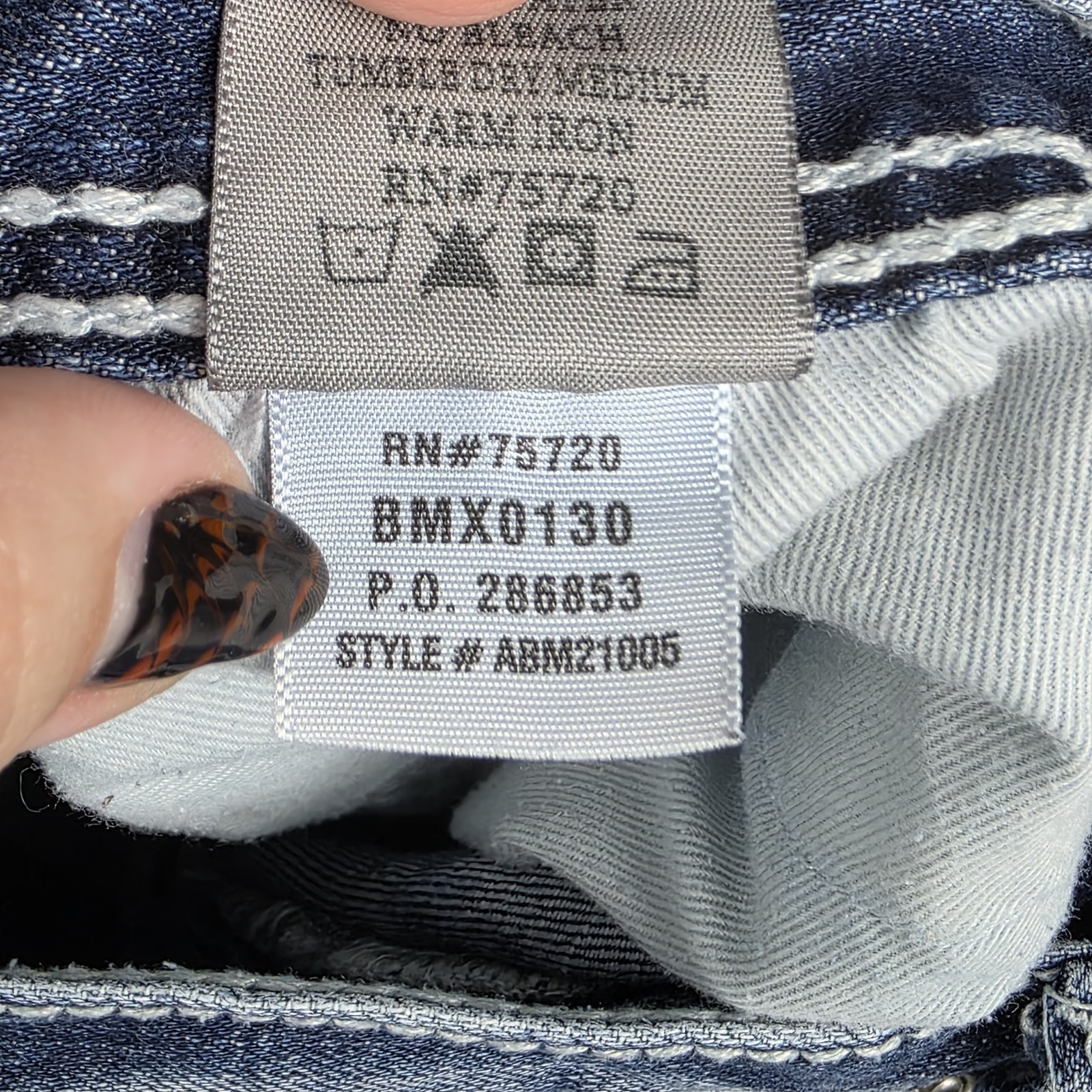 The product is a pair of BKE Jeans Men's Size 31R Aiden Bootcut Distressed Blue Denim Pants. These pants feature a low rise, bootcut style, and are made of denim fabric with added spandex for comfort and stretch. They have a zip and button closure, a 5-pocket design, and are machine washable. The distressed look and embroidered accents give them a trendy and stylish appearance, suitable for all seasons. The western theme and USA-inspired design make these jeans a fashionable choice for men looking for a unique and comfortable denim option.