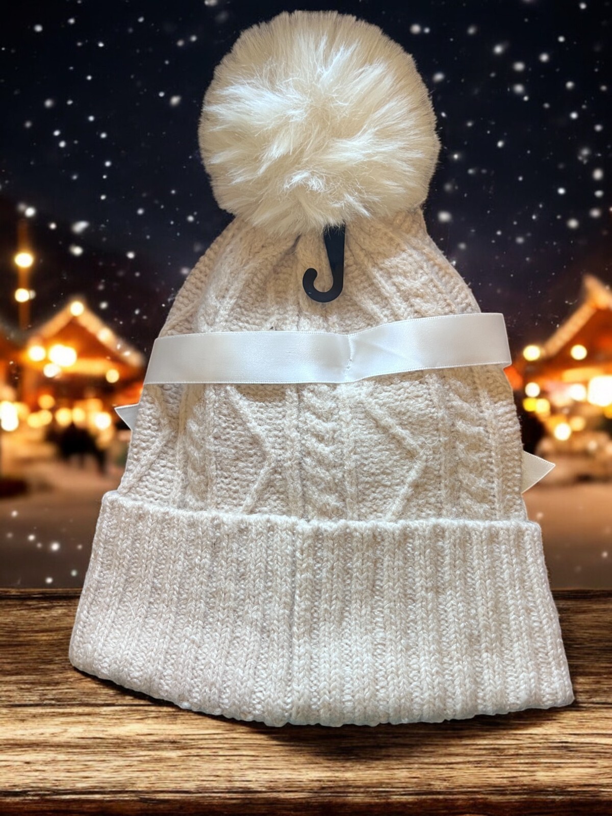 * Beanie: Black cable knit design with a soft faux fur pom-pom on top for added flair.