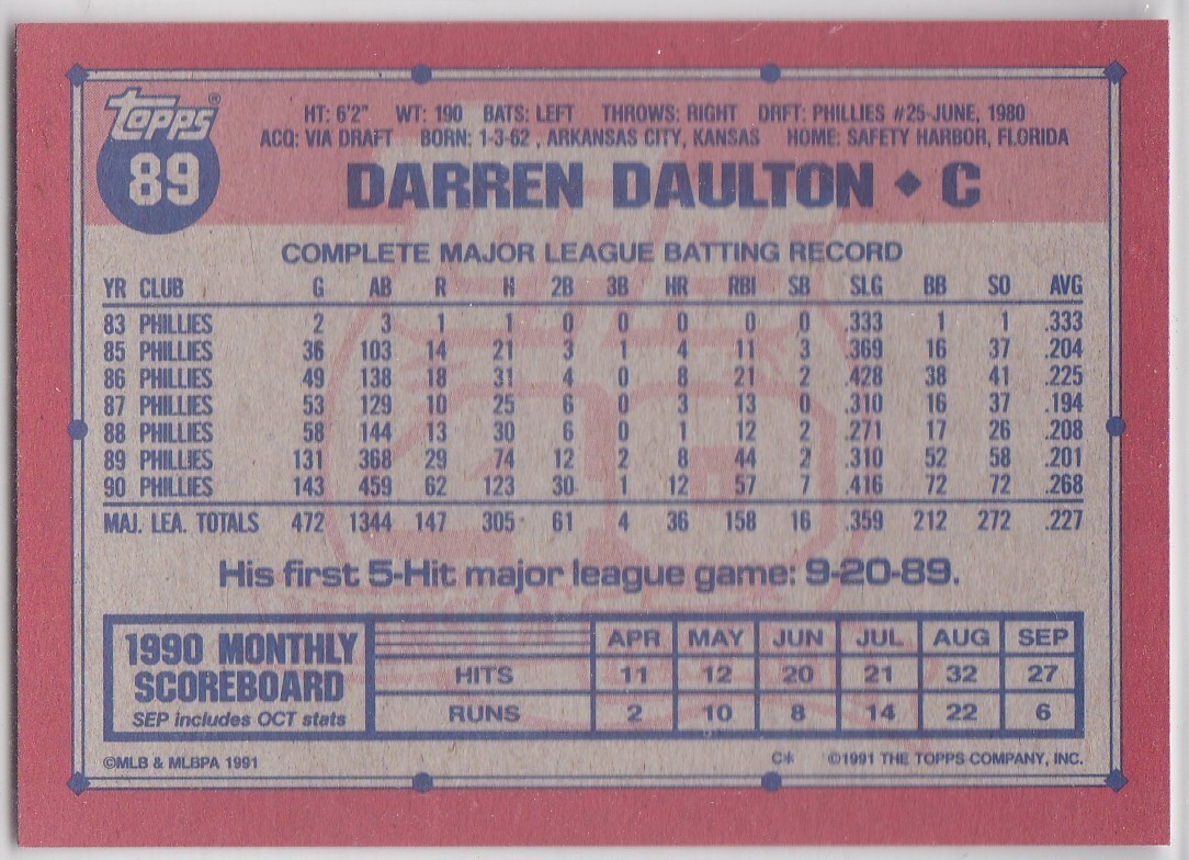 M) 1991 Topps Baseball Trading Card - Darren Daulton #89