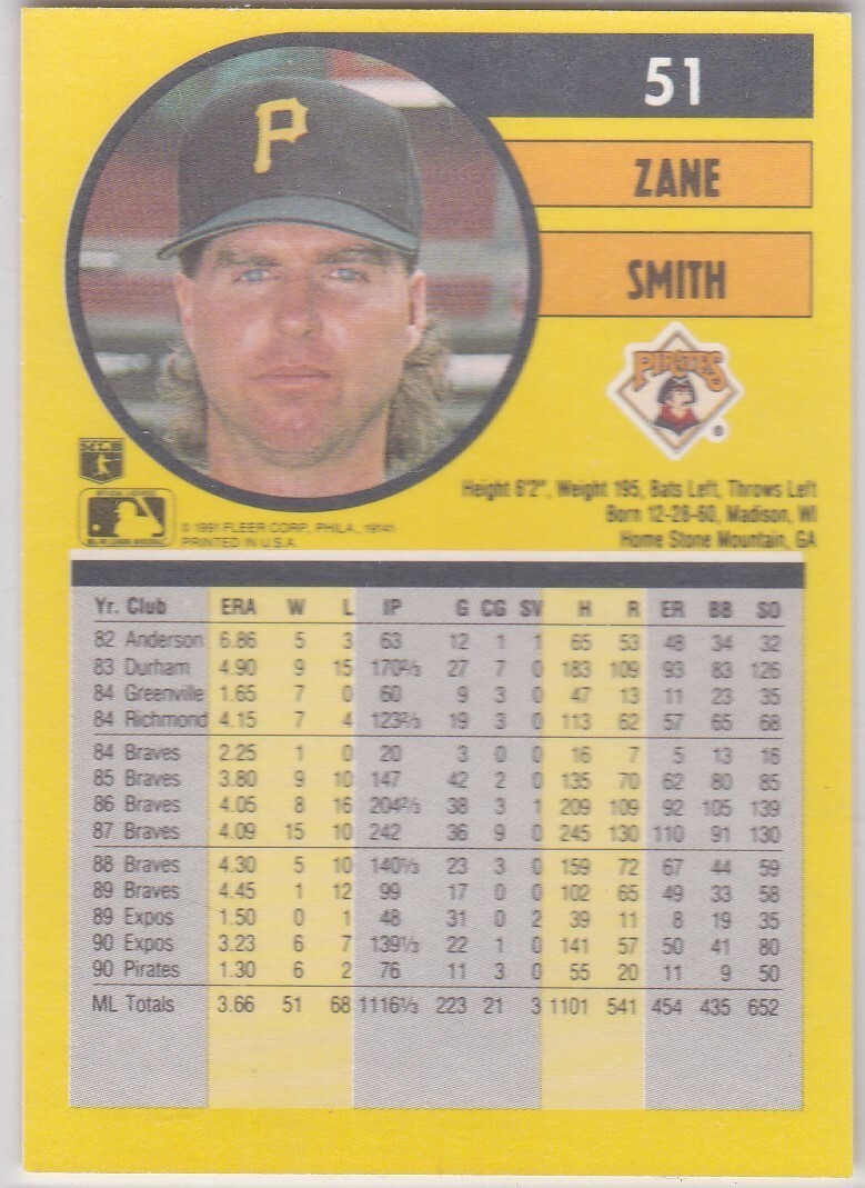M) 1991 Fleer Baseball Trading Card - Zane Smith #51
