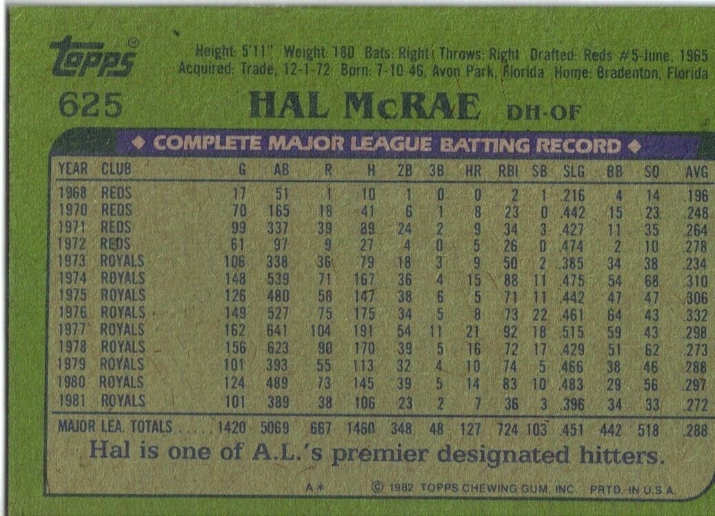 1982 Topps Hal Mcrae Kansas City Royals #625 and 50 similar items