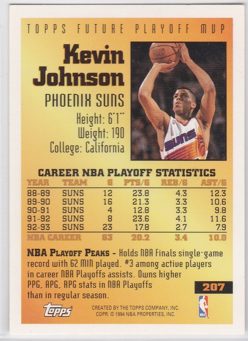 M) 1993-94 Topps Basketball Trading Card - Kevin Johnson #207
